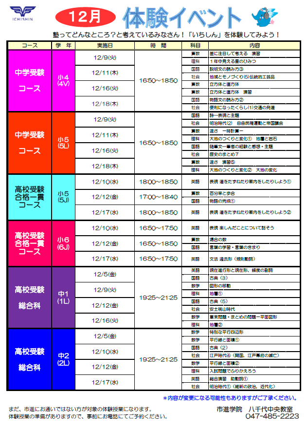 市進では、「12月体験授業」を実施します。 皆様のご参加をお待ちしております。 八千代中央教室の体験授業の日程については 下記をご確認ください。