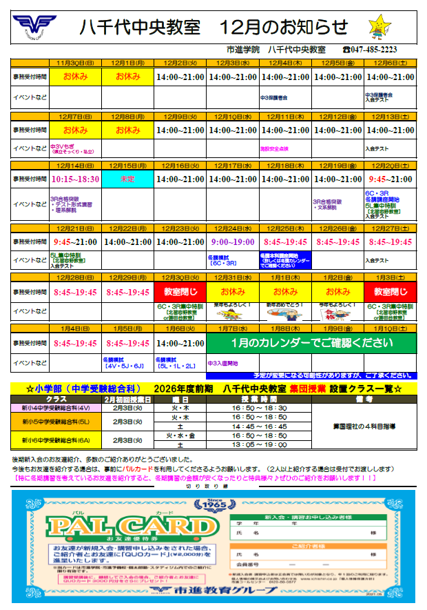 12月の受付時間をアップしました。 八千代中央教室の受付時間については 下記をご覧ください。 また、12月の入会テストは・・・ 12/6(土)14:30~16:00 12/13(土)14:30~16:00 12/20(土)14:30~16:00 12/27(土)14:30~16:00 です。 勉強を頑張ろうと思っている方は ぜひの受験をお待ちしています! (日程や時間のご都合が合わない方はお気軽にご相談ください) 市進学院八千代中央教室 TEL:047-485-2223 |