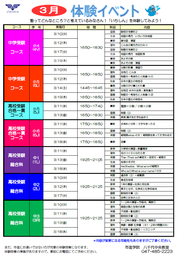 市進では、「3月体験授業」を実施します。 皆様のご参加をお待ちしております。 八千代中央教室の体験授業の日程については 下記をご確認ください。