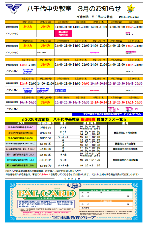 3月の受付時間をアップしました。 八千代中央教室の受付時間については 下記をご覧ください。