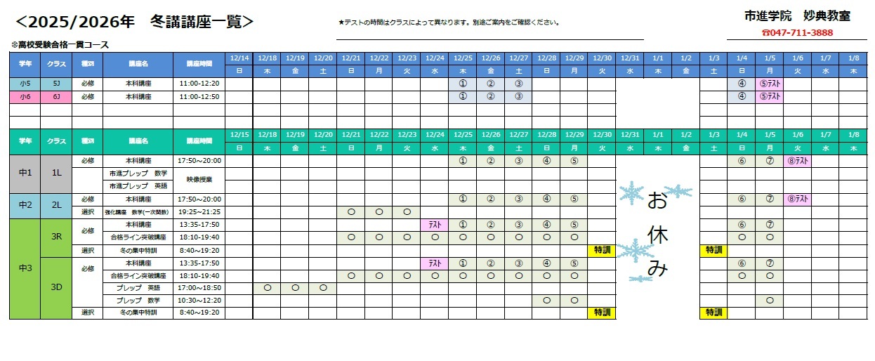 ![]() 冬期講習の日程になります。 冬期講習料半額! さらに! いまご入会いただくと 初月完全無料、入会金無料 小6生は上記に加えて 12月~2月まで授業料無料! お問合せは市進学院妙典教室まで! |