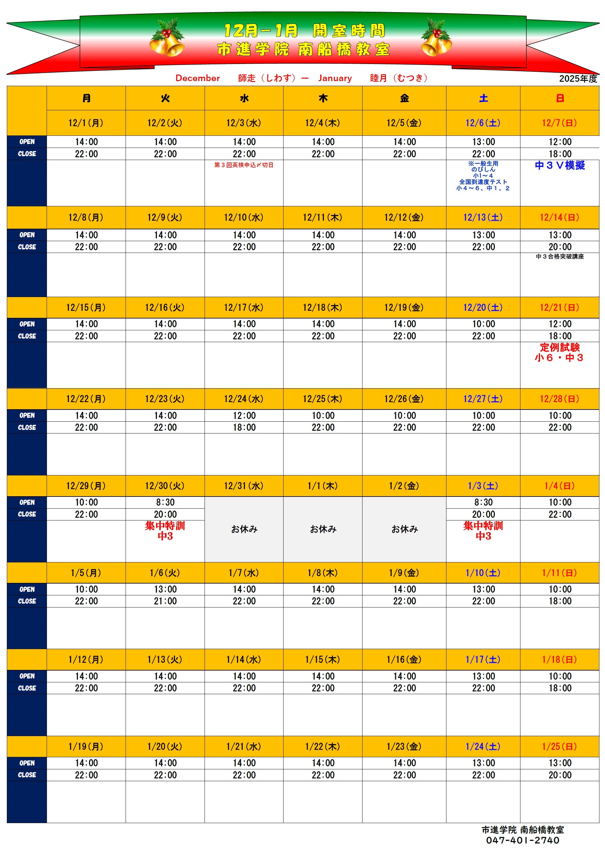 | 実施日時 | 2025/12/6(土) 小4~小6 14:00~15:20 中1~中2 18:00~19:20 日程が合わない場合、ご相談ください |