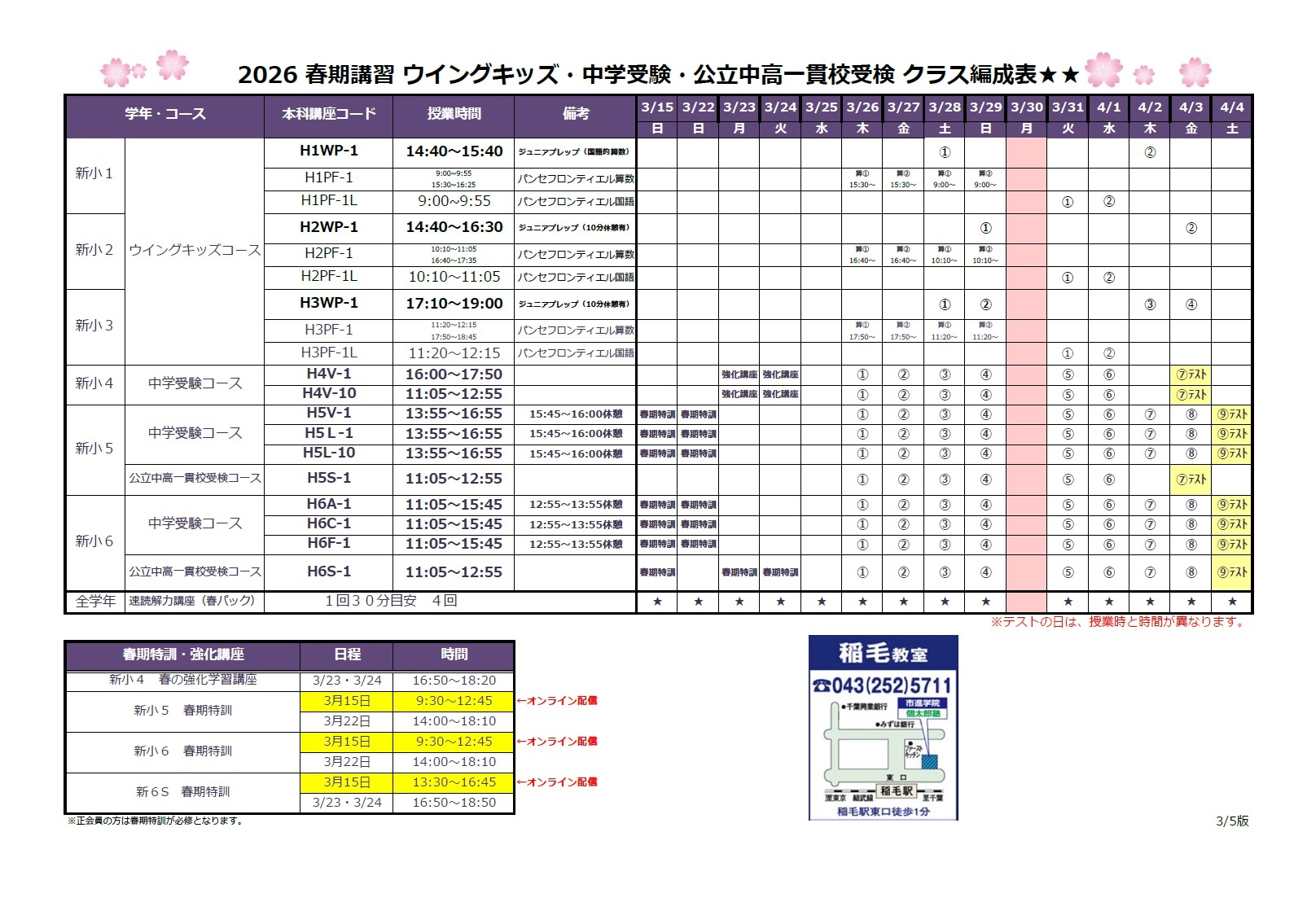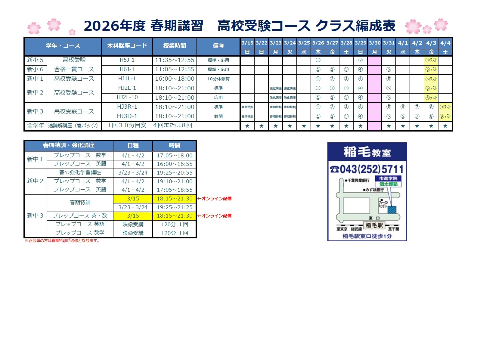 いよいよ3月26日から春期講習が始まります。 ただいま稲毛教室では講習生を対象に全クラスの本科授業料50%OFFキャンペーンを実施しております。 また、小学5,6生の公立中高一貫校コース、中学1年生の高校受験コースを受講の方は本科授業料が無料となるキャンペーンも実施しております。 この機会にぜひ市進学院で勉強しましょう!! クラス編成表にて日程不都合が無いかご確認ください。 お問い合わせは 市進学院 稲毛教室まで ☎︎043-252-5711(電話受付時間:月〜土 14:00~20:30) |