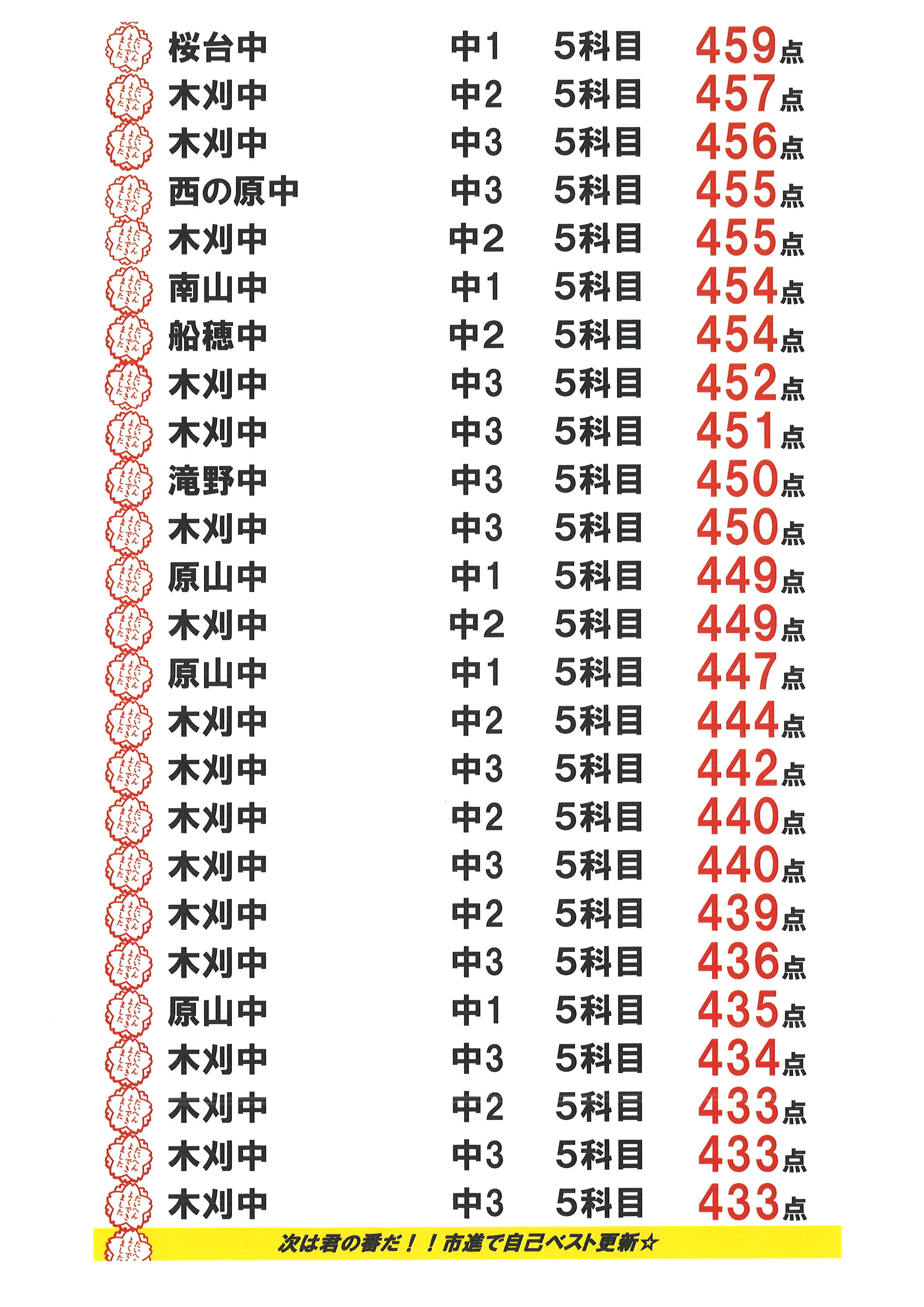 (対象中学 木刈中、原山中、船穂中、桜台中、西の原中、小室中など)
