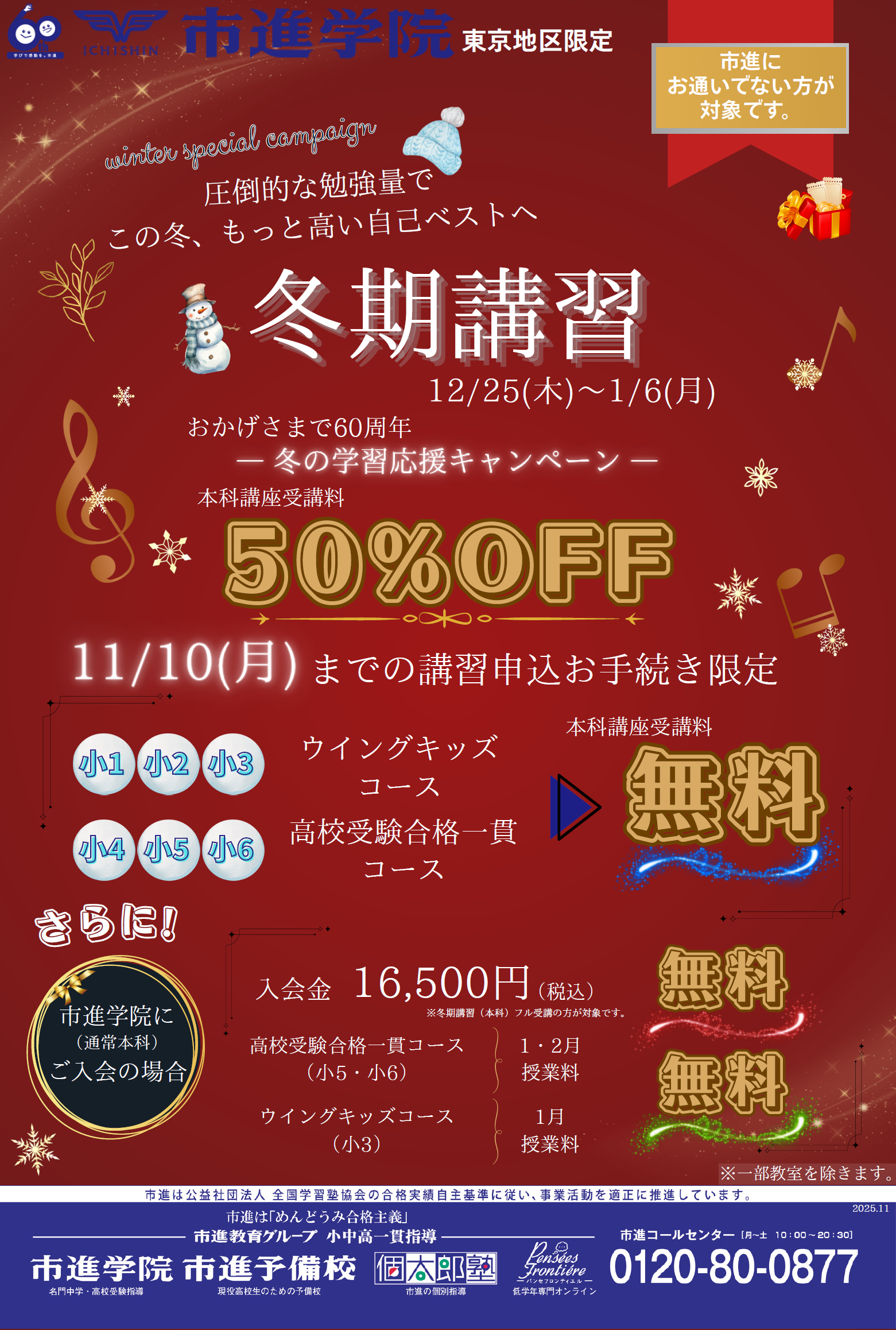 冬期講習の早期申込受付を開始しております!! 市進はおかげさまで60周年!お得なキャンペーンを実施中です♪ 11月10日までのお申し込みで… 小1小2小3のウィングキッズコース 小4小5小6の高校受験コース にお申込みの皆様は冬期講習本科が無料で受講可能です!! 他の学年・コースも一部のコースを除いて本科受講料50%OFFで受講可能! さらに、同時にご入会の場合 初月の授業料&入会金が無料! 小3限定(ウィングキッズコース):1月授業料無料! 小5・小6限定(高校受験コース):1月・2月授業料無料!