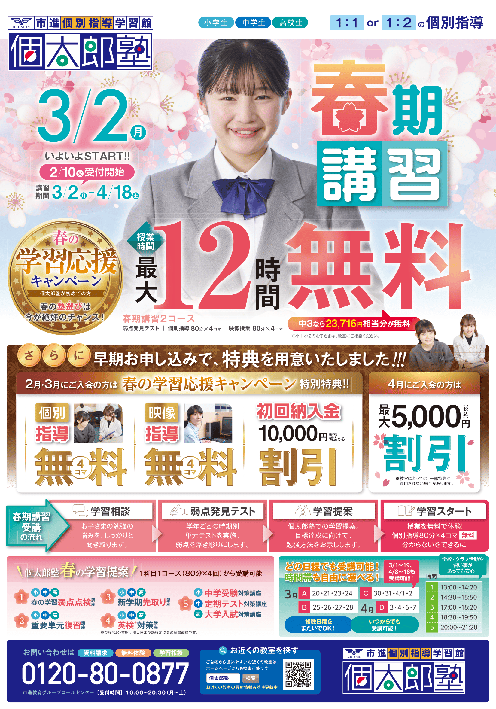 個太郎塾の個別指導では、生徒ごとに合わせた最適な授業で、 日々の復習から受験勉強 まで 全面的にバックアップ ! 保護者様やお子様の お悩み・希望をシッカリお伺い したうえで、指導内容をご提案いたします。 無料体験授業を複数回体験 いたただけますので、是非、個太郎塾藤が丘教室をご体験ください! お申込み・お問い合わせ何か気になる点、ご不明点がございましたら、お気軽にご連絡ください。お電話お待ちしております。 個太郎塾 藤が丘教室 月~土 14:00 ~ 21:30