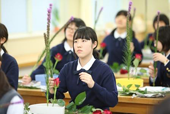 中学校3年間では、日本の伝統文化を学ぶ時間を授業の中に組み込み、1年で礼法を兼ねて茶道、2年では生きたお花に親しむ華道、3年では筝曲を学びます。