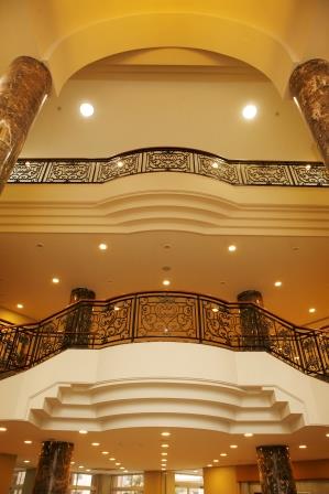 正面玄関を抜けると、明るいエントランスホールが広がります。大理石の床・壁・柱と繊細な装飾が施された階段の手すりが、女子校らしい優雅な雰囲気を醸し出しています。