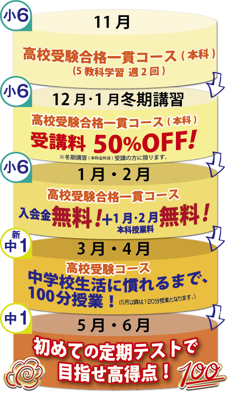 上記特典は、ご入会から継続して3月に中1高校受験コースに在籍されることが条件です。