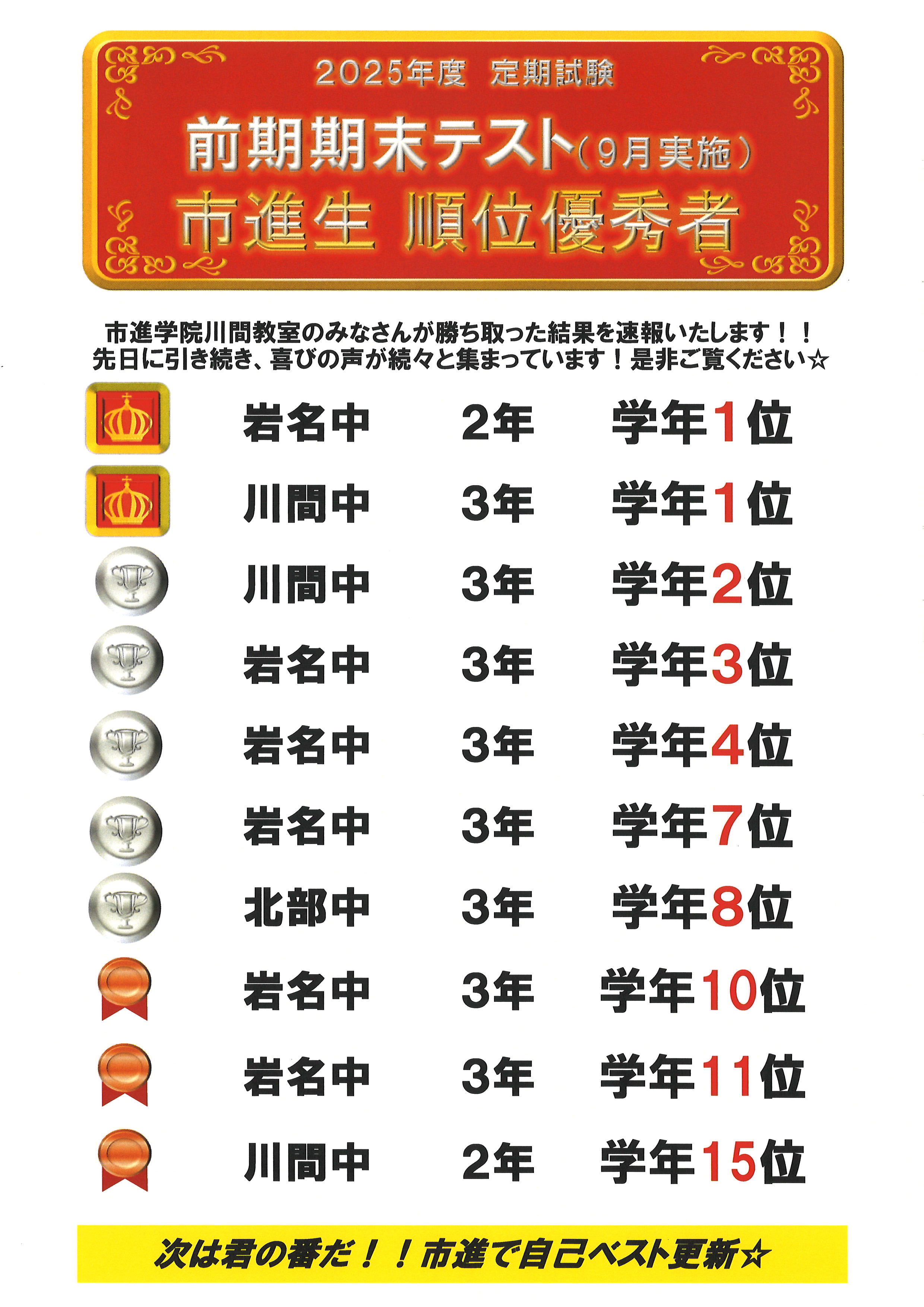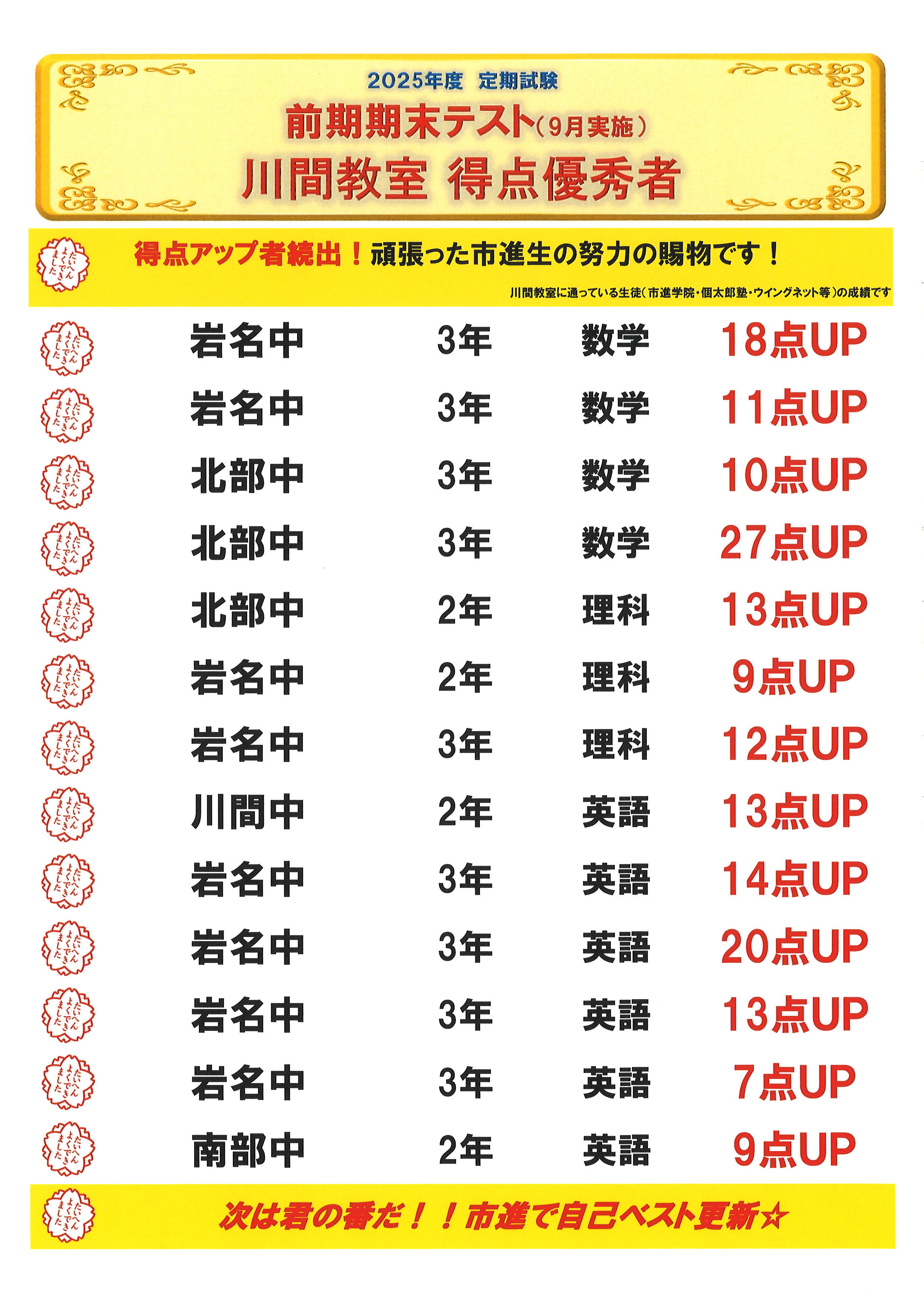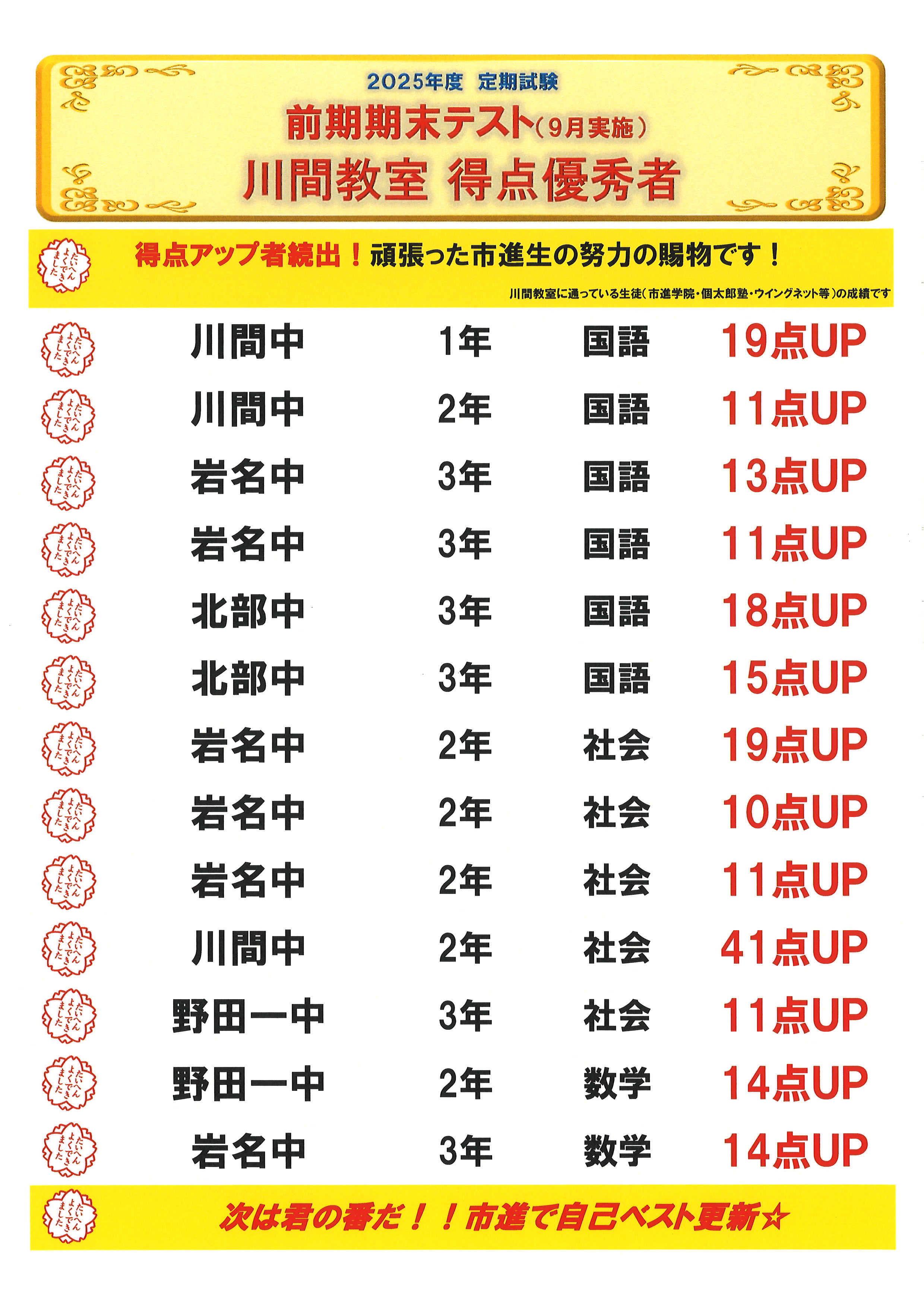 最新の定期テストの結果です。(市進学院 川間教室 & 個太郎塾 川間教室)