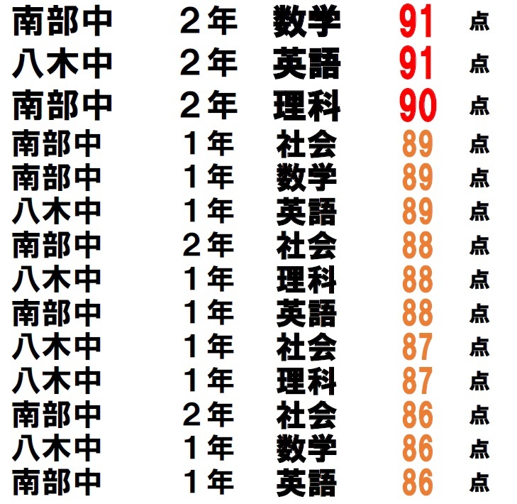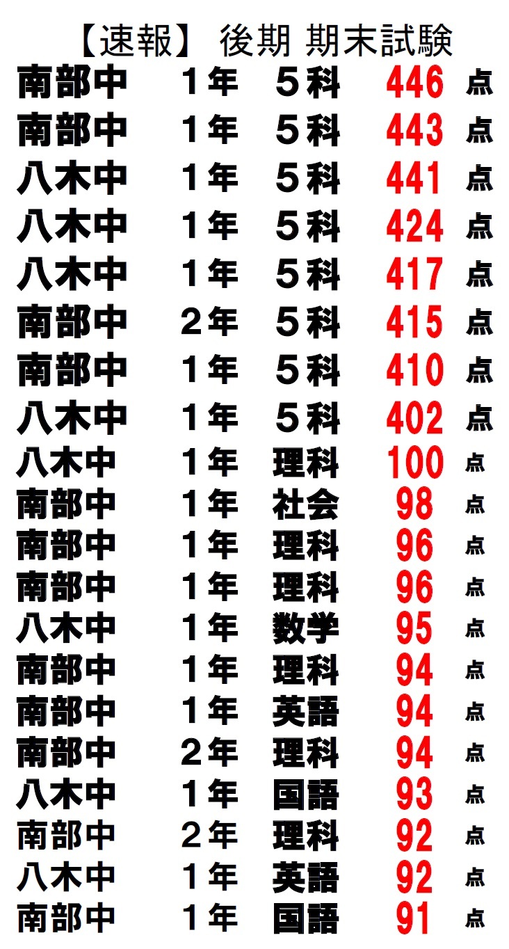 流山セントラルパーク教室に通う生徒たちの主な点数です。 毎週土曜日のワークマラソンや、高得点道場での学習の成果を発揮してくれました! ※今回は中1・中2のみの掲載となります。 ![]()