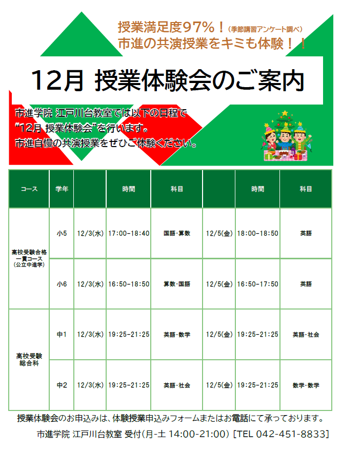 | 実施日時 | 2025/12/6(土) 小4~小6 14:00~15:20 中1~中2 19:15~20:30 日程が合わない場合、ご相談ください |