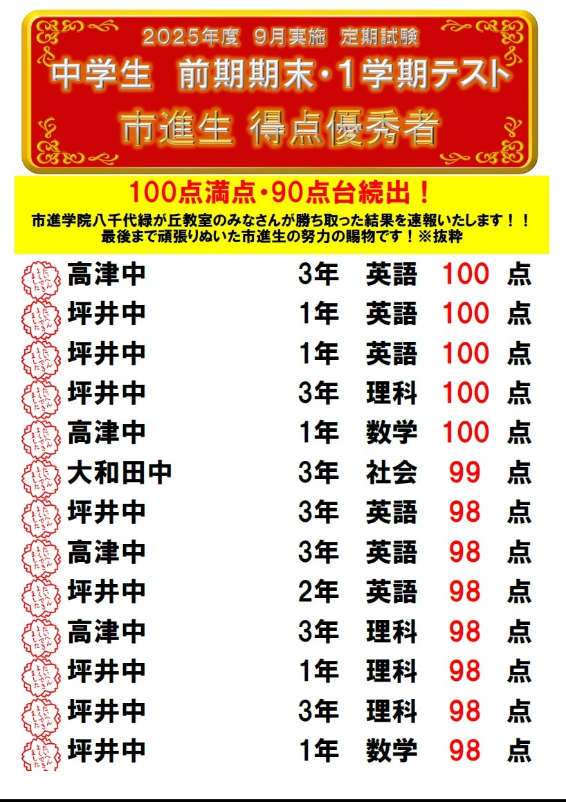 市進学院八千代緑が丘教室では中学校の定期テスト前に限らず、恒常的に定期テスト対策「高得点道場」を実施しています。 【対象】高津中・坪井中・東高津中・大和田中 など 【日時】毎授業終了後 ①質問室 学校のワークをどんどん進めよう! 解きながら分からないところがあれば、その場で先生に質問できます。 ②テスト直前!予想問題実施 各学校のテスト範囲と過去問を参考に作成した、予想問題(てきプリ)をお渡しします。 これで高得点を確実なものにいたします。 ③自習室を常時開放 授業がない日も、教室が開いているときは常に自習室を開放しています。 ※自習室の開室日時は月ごとの「受付時間のお知らせ」をご覧ください。 ※お申し込みはLINE・電話より受け付けております。