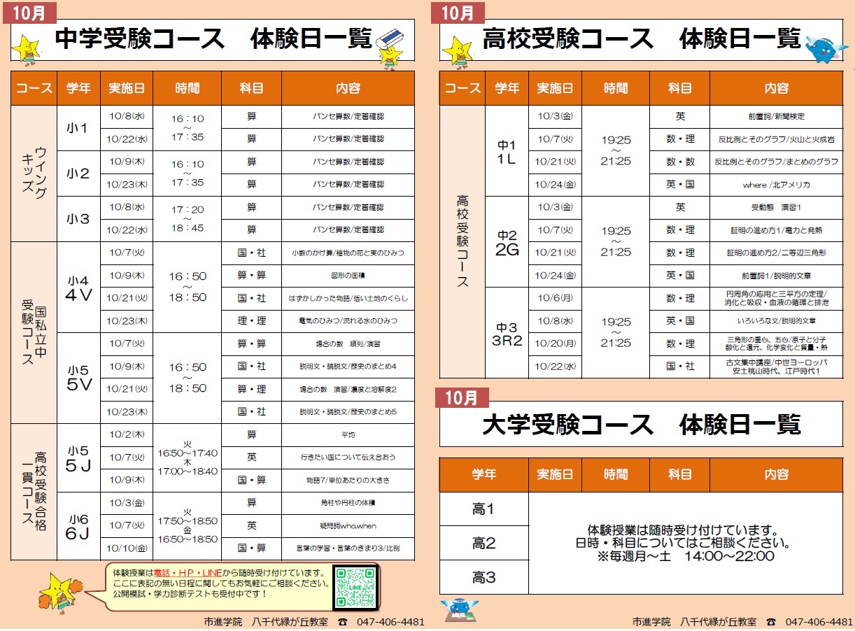 お問い合わせ・お申し込みは 市進学院八千代緑が丘教室 ☎047-406-4481 |