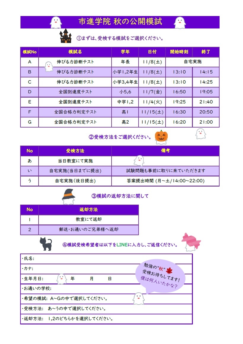 市進学院では、無料学力診断テストと 無料体験授業を随時受け付けております。 市進へのご入会を検討されている方、 塾選びに迷われている方、 お子様の現在の学力を知りたい方、 学力診断テストを受験してみませんか? ★学力診断テスト受験可能曜日・時間 月曜日~土曜日 14:00~22:00 ※お電話でご予約ください。 ★科目 小学生 算・国 (90分) 中学生 数・英 (90分) ★無料体験授業 理系・文系1日分ずつの体験授業ができます。 ※日によって教科が異なります。(持ち物 筆記用具・ノート) お問い合わせ・お申し込みは★★★こちら★★★ 市進学院八千代緑が丘教室 047-406-4481 |