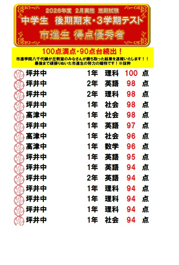 市進学院八千代緑が丘教室では中学校の定期テスト前に限らず、恒常的に定期テスト対策「高得点道場」を実施しています。 【対象】高津中・坪井中・東高津中・大和田中 など 【日時】毎授業終了後 ①質問室 学校のワークをどんどん進めよう! 解きながら分からないところがあれば、その場で先生に質問できます。 ②テスト直前!予想問題実施 各学校のテスト範囲と過去問を参考に作成した、予想問題(てきプリ)をお渡しします。 これで高得点を確実なものにいたします。 ③自習室を常時開放 授業がない日も、教室が開いているときは常に自習室を開放しています。 ※自習室の開室日時は月ごとの「受付時間のお知らせ」をご覧ください。 ※お申し込みはLINE・電話より受け付けております。