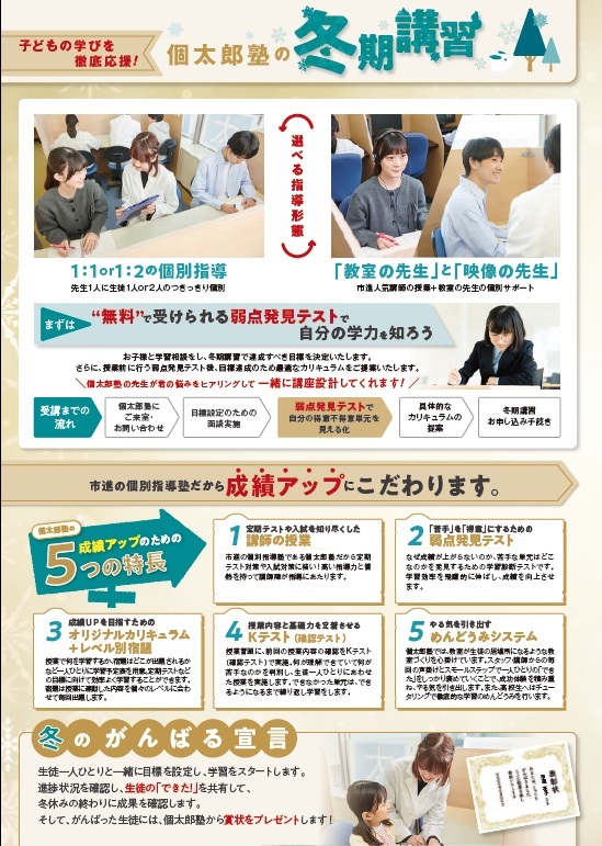 個太郎塾では、「短期受講」を利用し、集中的に目的に合わせた学習が可能です!通常個別指導を受講していない方にもお勧めです。