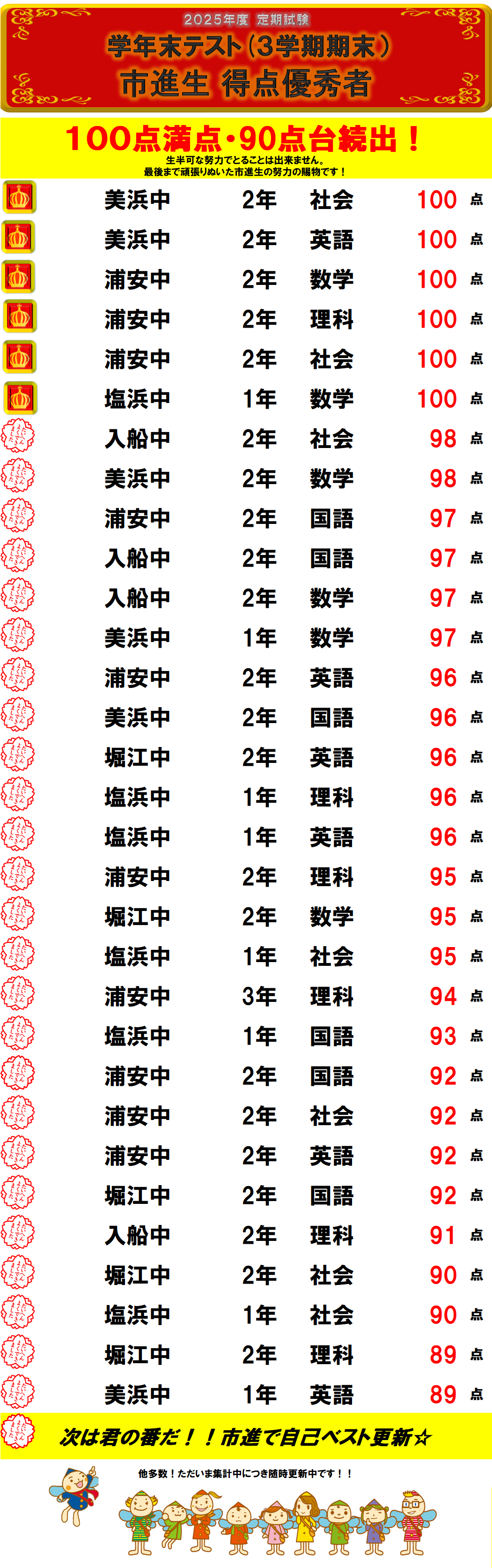 25年度最後の定期試験である学年末テストが行われました。 市進学院浦安教室・個太郎塾浦安教室の生徒たちは今回の定期試験も頑張ってくれました!! 一部ではありますが、皆さんの努力の成果をこちらで紹介させていただきます。 これからも生徒たちの成長を応援していきます!! 浦安教室には、浦安中・美浜中・堀江中・入船中・南行徳中・塩浜学園中などの生徒が通い、勉強と部活の両立に励んでいます。 浦安中・美浜中・堀江中・入船中・南行徳中・塩浜学園中においては、学年トップ10位に複数名が名前を連ねています。 市進学院浦安教室の定期試験対策は、無料でどなたでも参加できますので、ぜひご参加ください! |