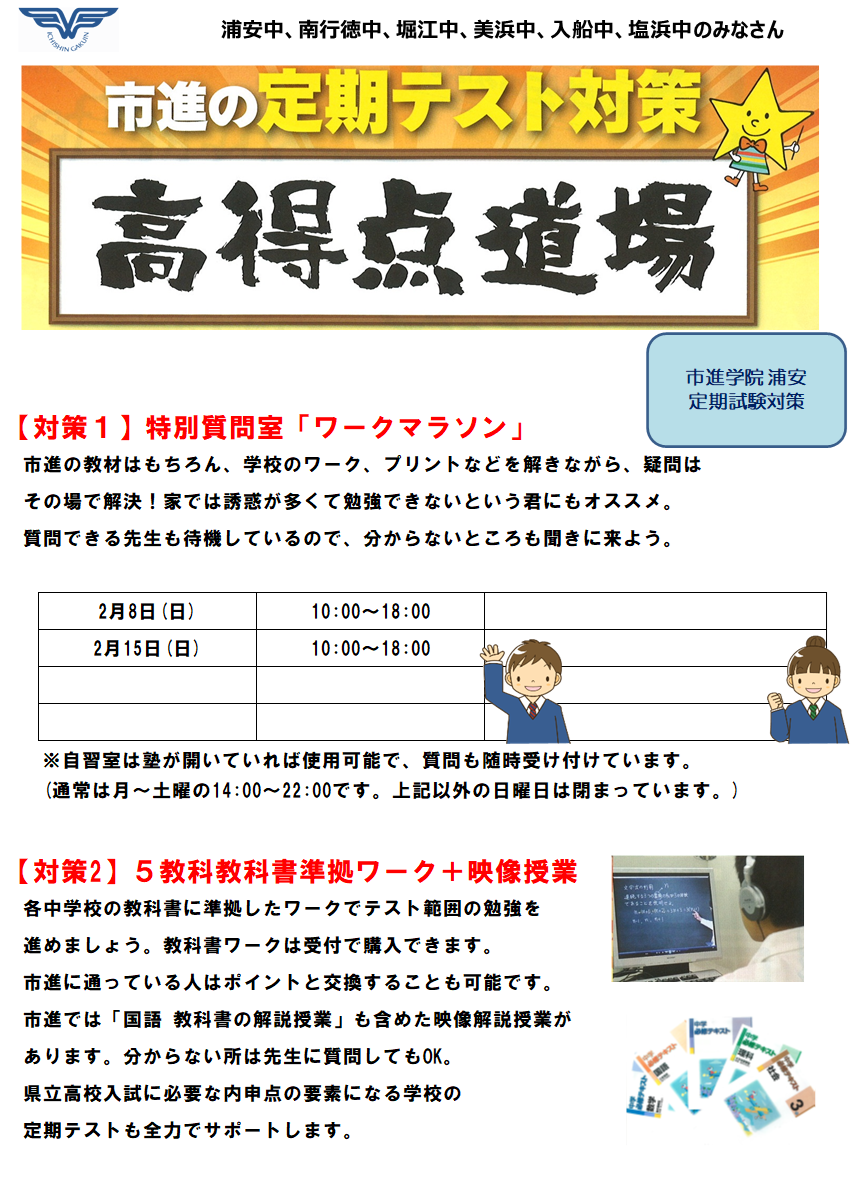 市進学院に併設されておりますので、進路指導相談や定期テスト対策など市進学院と同様のフォローが受けられます。
