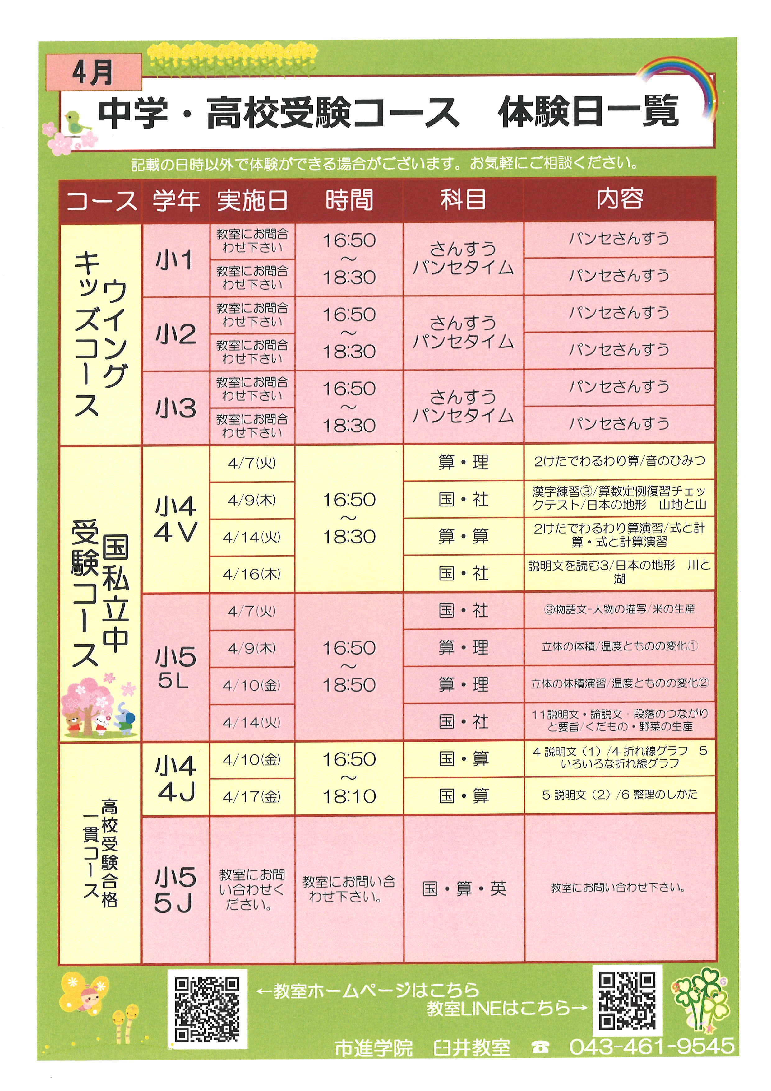 ![]() 学力診断テスト・無料体験授業 市進学院では、無料学力診断テストと無料体験授業を随時受け付けております。 市進へのご入会を検討されている方、塾選びに迷われている方、 お子様の現在の学力を知りたい方、学力診断テストを受験してみませんか? ★学力診断テスト受験可能曜日・時間 火曜日~土曜日 14:00~22:00 ※お電話でご予約ください。☎043-461-9545 ★科目 小学生 算・国 (90分) 中学生 数・英 (90分) ★無料体験授業 理系・文系1日分ずつの体験授業ができます。 ※日によって教科が異なります。(持ち物 筆記用具・ノート) |