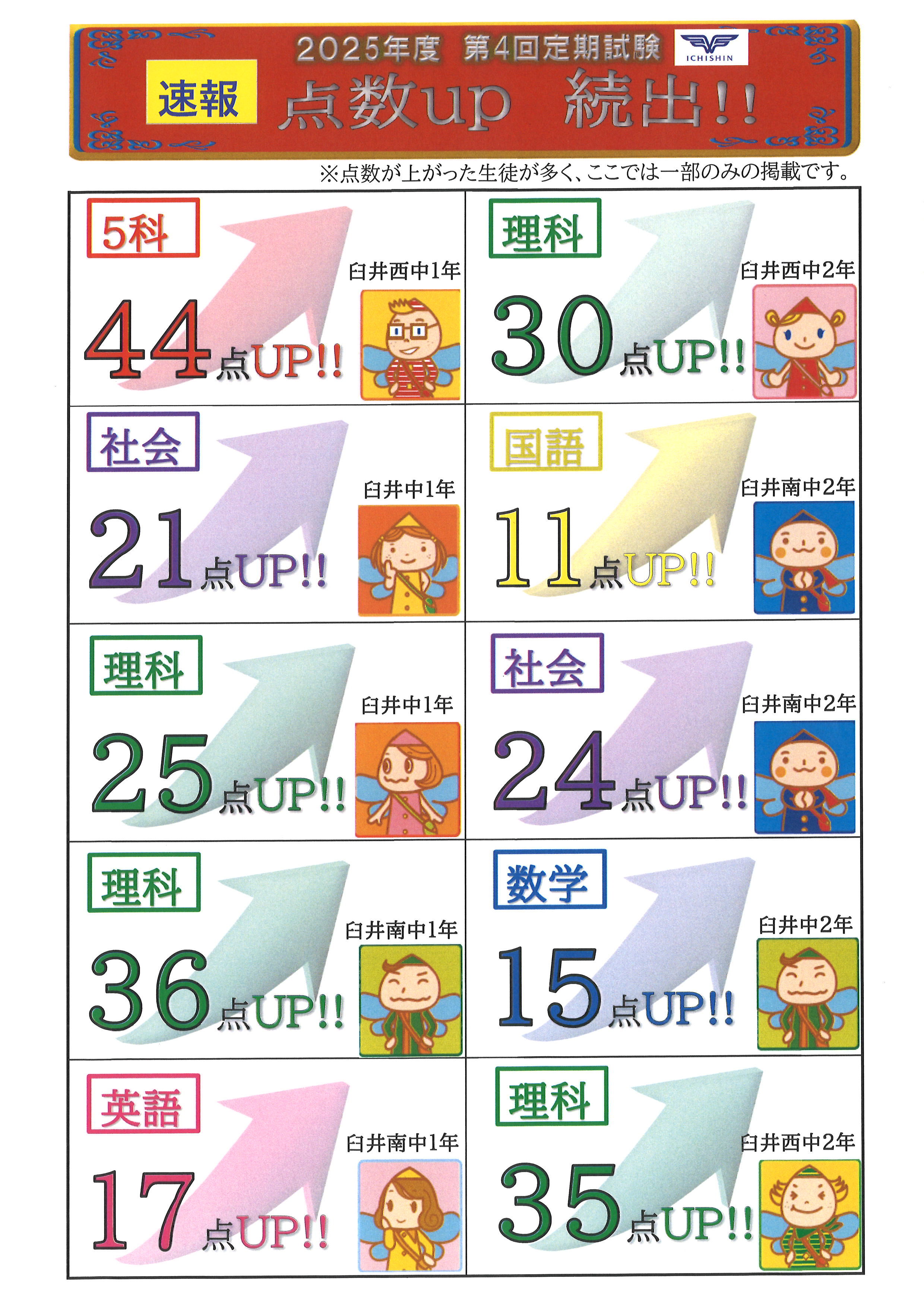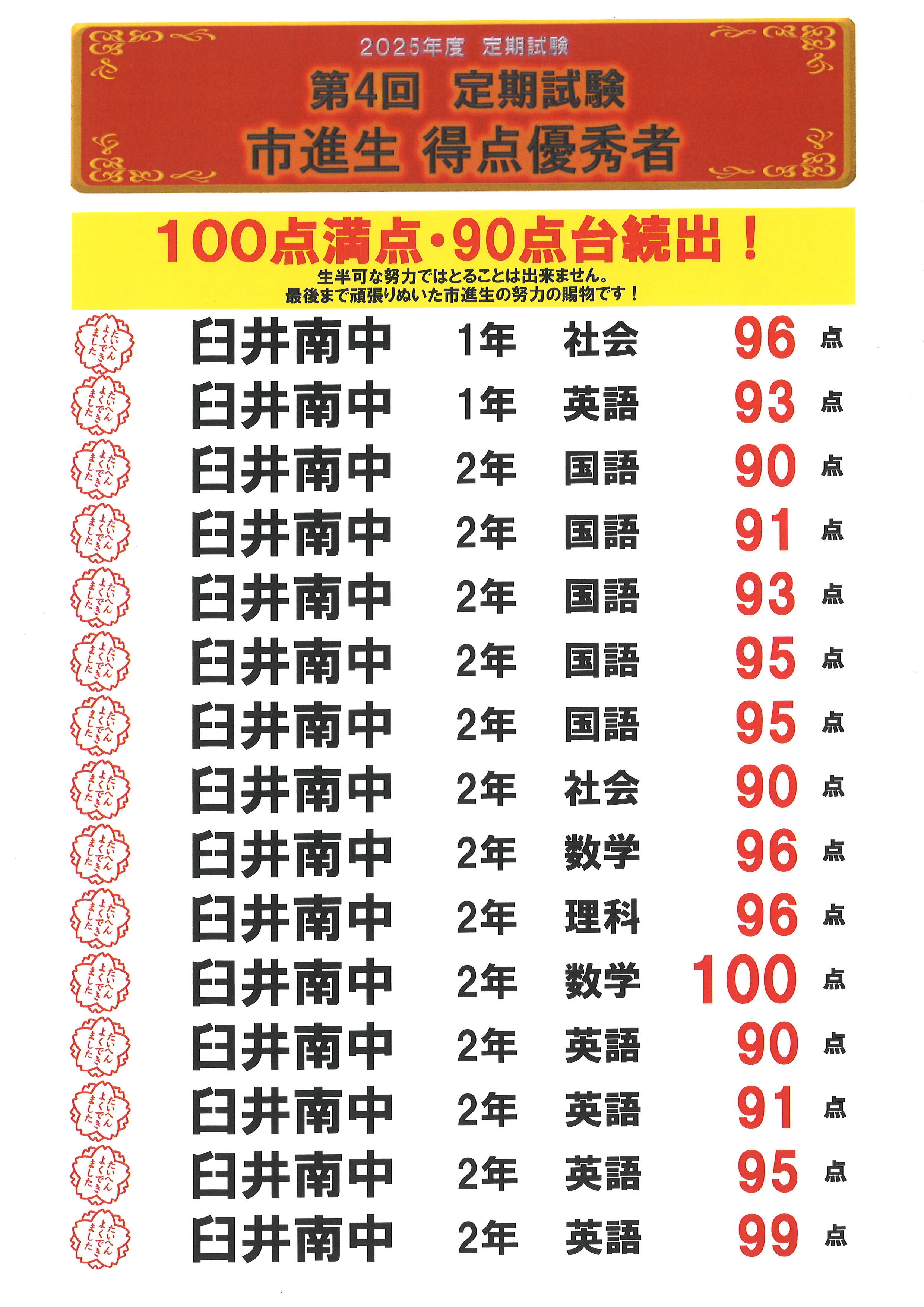 市進学院 臼井教室 合格速報 合格おめでとうございます! ★大学入試2026年春合格実績★ 早稲田大2名 慶應大1名 東京理科大1名 中央大(法学部含む)2名 青山学院大1名 学習院大1名 専修大1名 ★高校入試2026年春合格実績★ 県立船橋高2名 佐倉高1名 小金高1名 八千代高校4名 木更津高専1名 幕張総合高1名 成田国際高1名 市川高1名 昭和秀英高2名 日大習志野1名 成田高3名 ★中学入試2026年春合格実績★ 芝浦工大柏中1名 成田中6名 国府台女子中1名 江戸川女子中1名 その他多数合格 2026年臼井教室 在籍生 大学受験 高校受験 中学受験 |