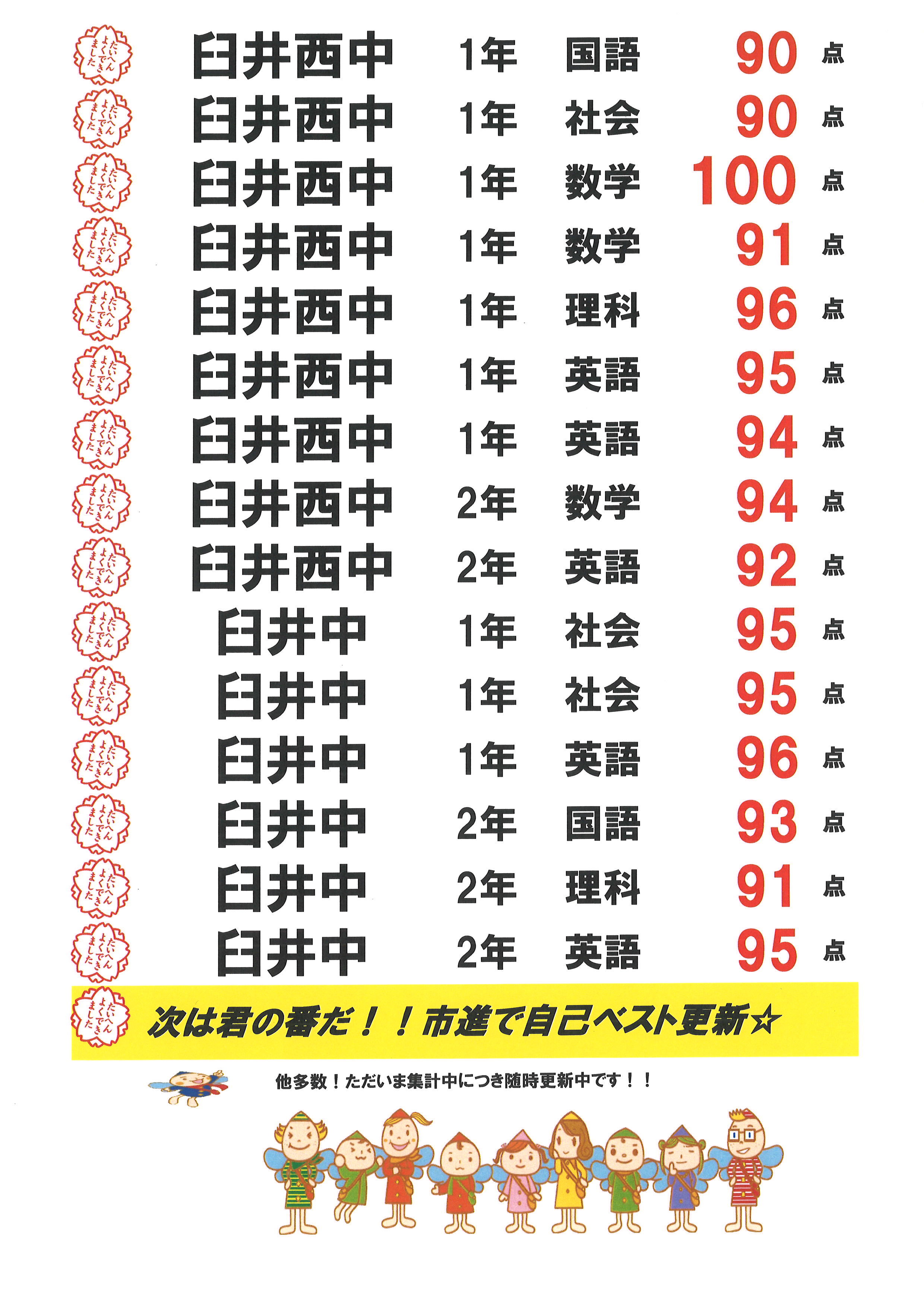 確かに、臼井南中、臼井中、臼井西中を中心として様々な学校の成績優秀者が臼井教室に在籍してくれています。しかし、成績優秀者を含め、どの生徒たちも初めはみんな同じく勉強のやり方、やる気の出し方、計画の立て方からのスタートです。市進の授業についていけるかな、授業中当てられて答えられなかったらはずかしいな、など市進に来る前は色々と悩むかもしれませんが、臼井教室では受付も先生も周りの友達もみんな仲間!