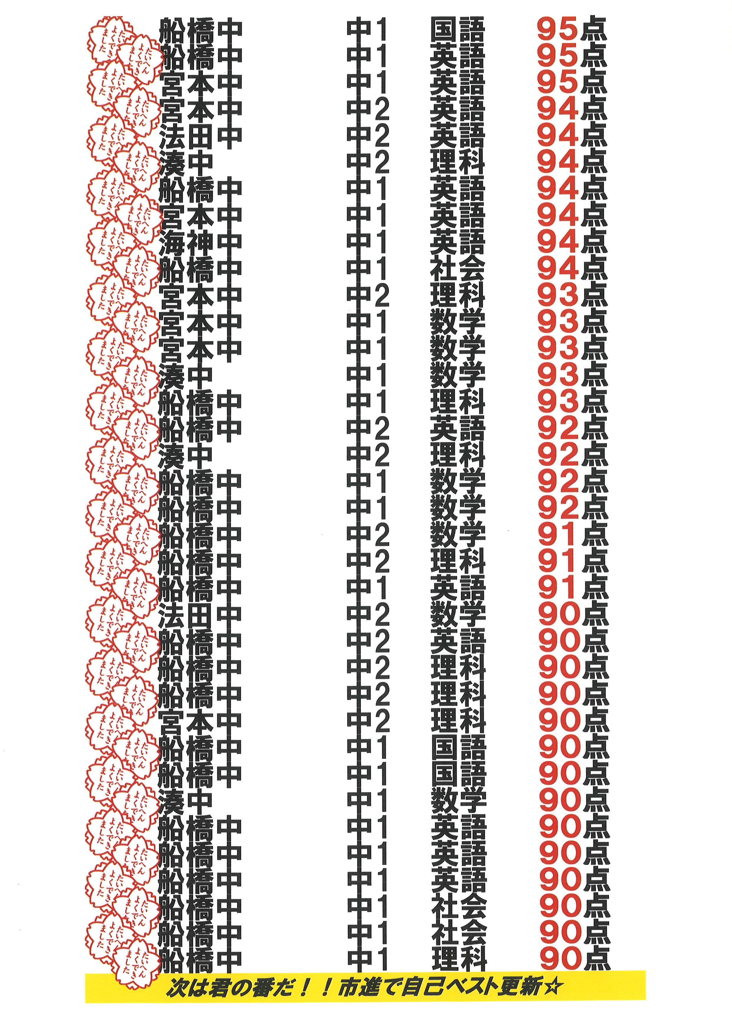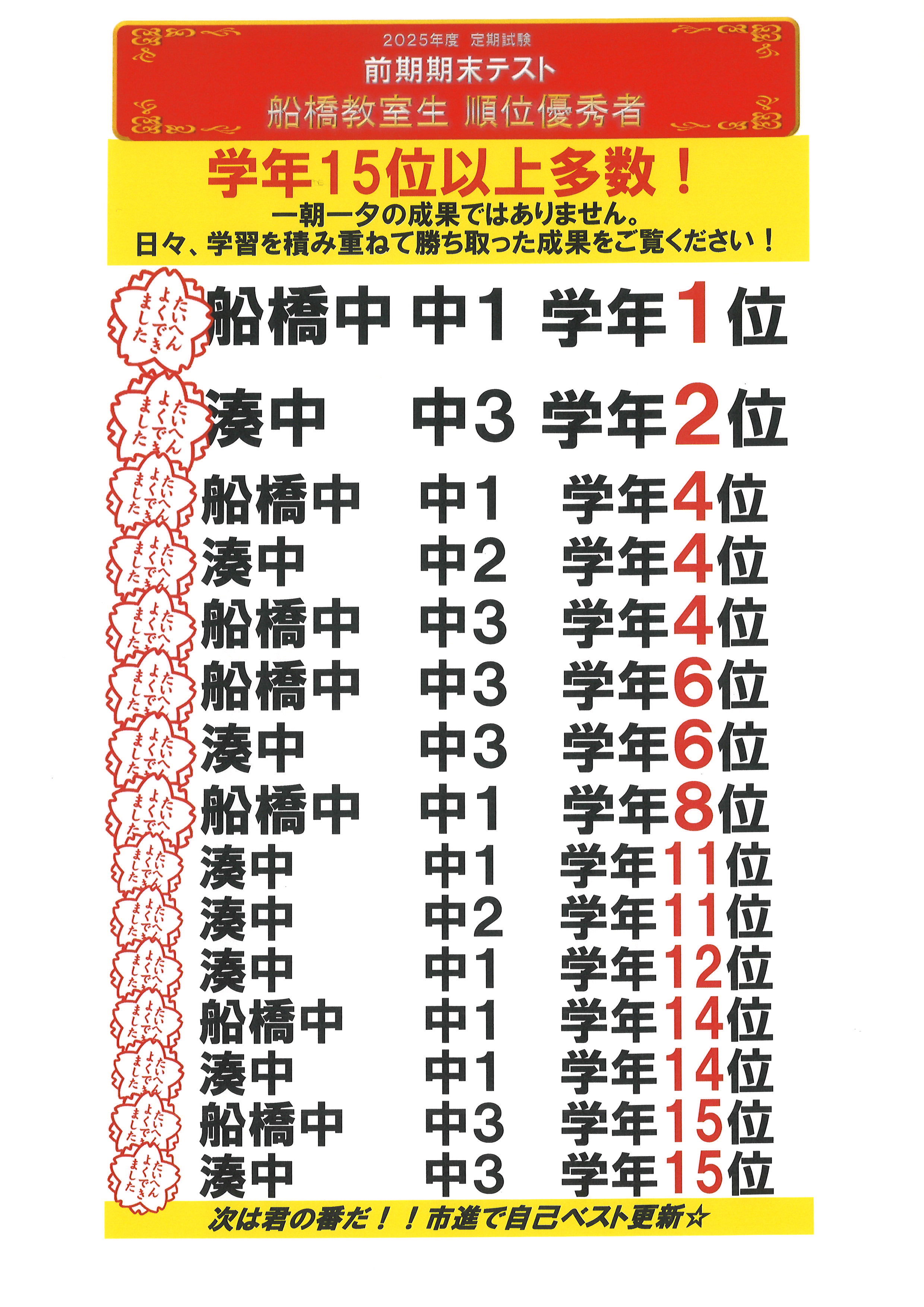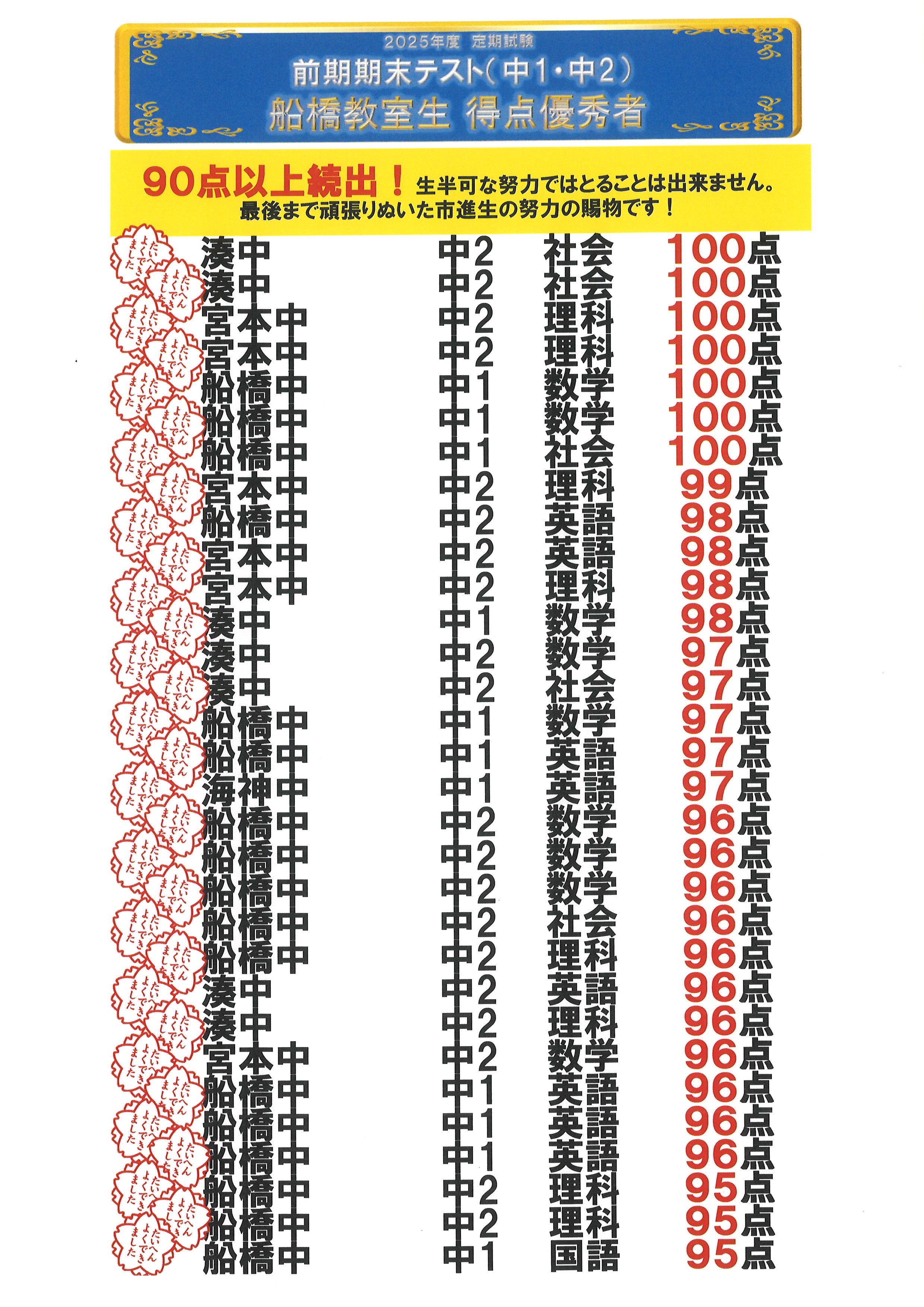 \前期中間テスト結果/ 船橋教室生の頑張りをご覧ください! ![]() ![]() ![]() ![]() 次はあなたの番です! |