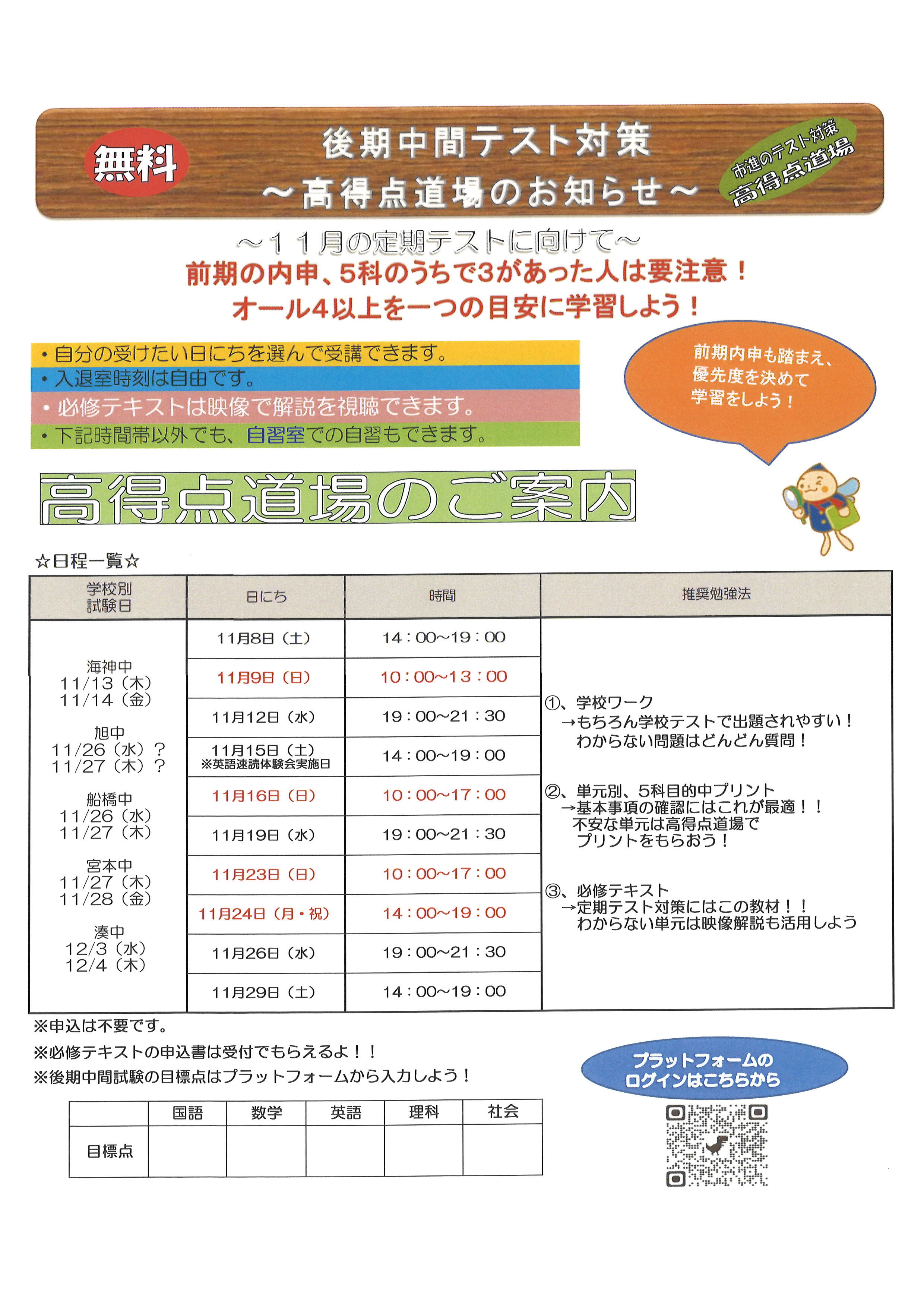 \前期期末テスト結果はこちらから/ 船橋中で学年1位が出ました! 船橋教室生の頑張りをご覧ください! \後期中間テスト対策のご案内/ テスト直前に不安な単元をチェックするチャンス!! 普段お通いでない方も参加いただけます。 詳細は教室までお問い合わせください。