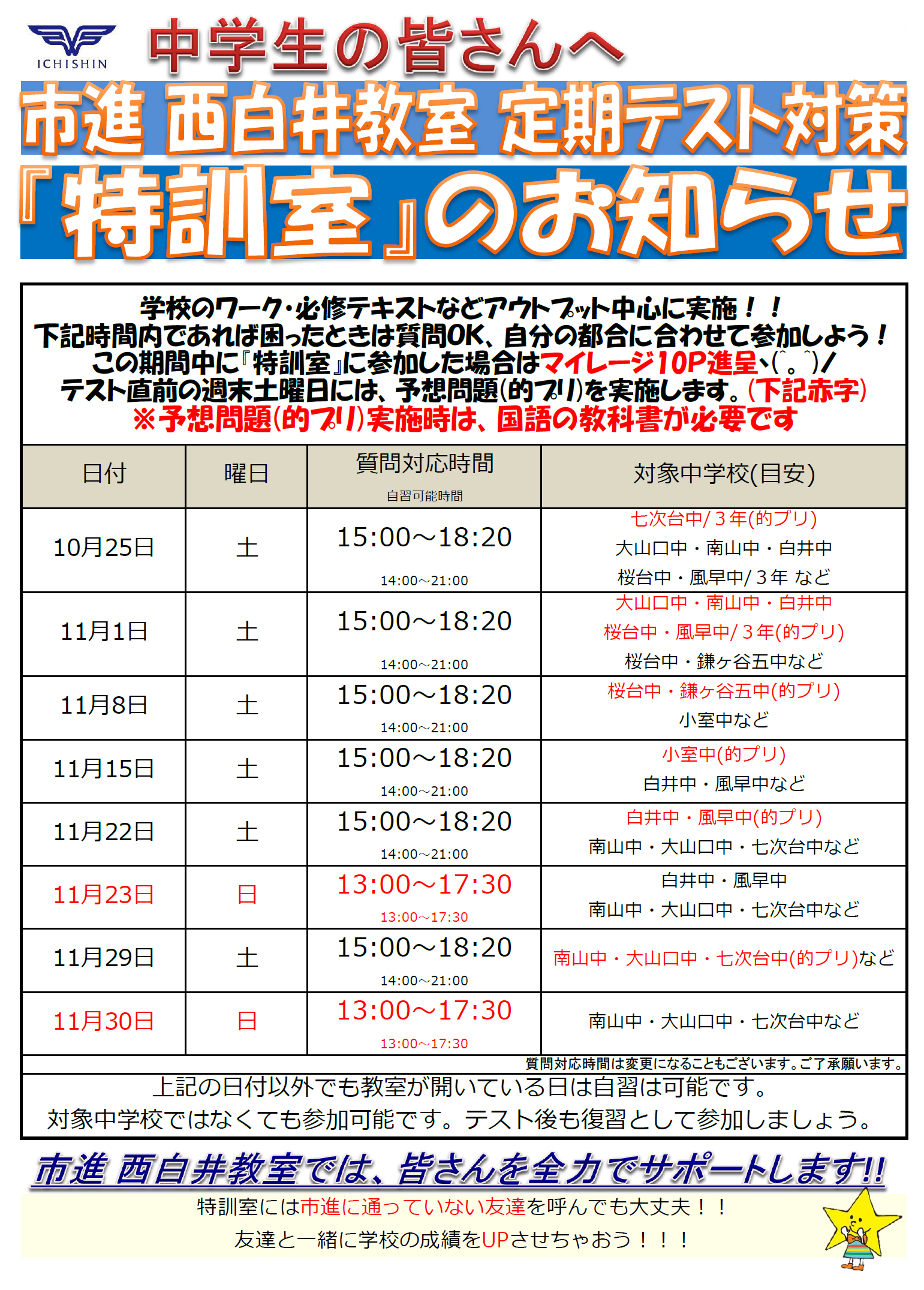 ![]() 学習応援CP実施します(^^)/ 西白井教室のスケジュールは こちらになります(^O^)/