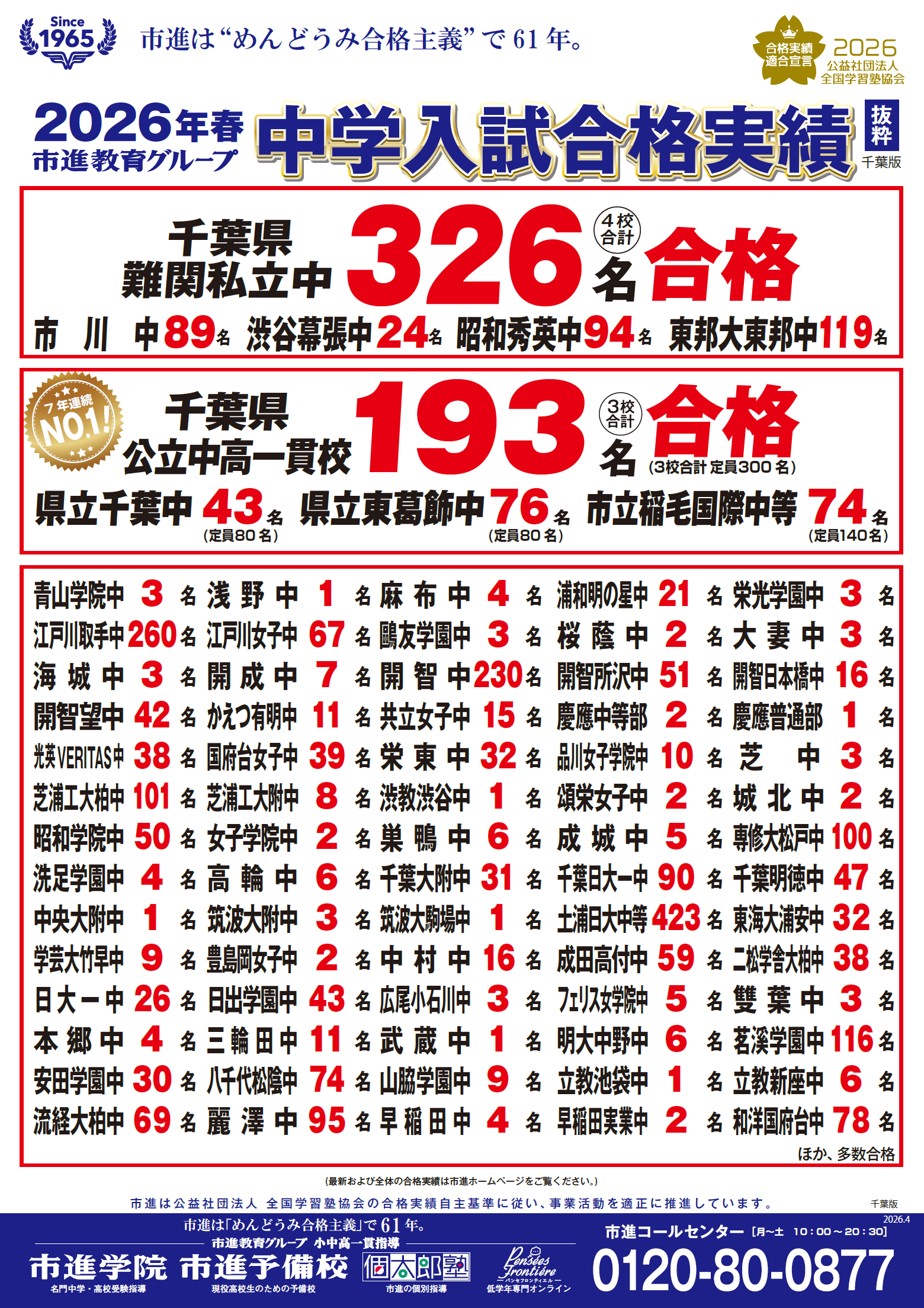 2026年春 中学入試結果 2025年度小6受験科在籍生全員合格!! (合格率100%) みんな頑張りました! おめでとう!! 江戸川取手 7名合格 県立東葛飾 1名合格 秀明八千代 1名合格 専大松戸 2名合格 千葉日大一 2名合格 土浦日大 1名合格 東邦大東邦 1名合格 東洋大牛久 1名合格 二松学舎柏 1名合格 茗溪学園 1名合格 八千代松陰 2名合格 流通経大柏 2名合格 麗澤 3名合格 など