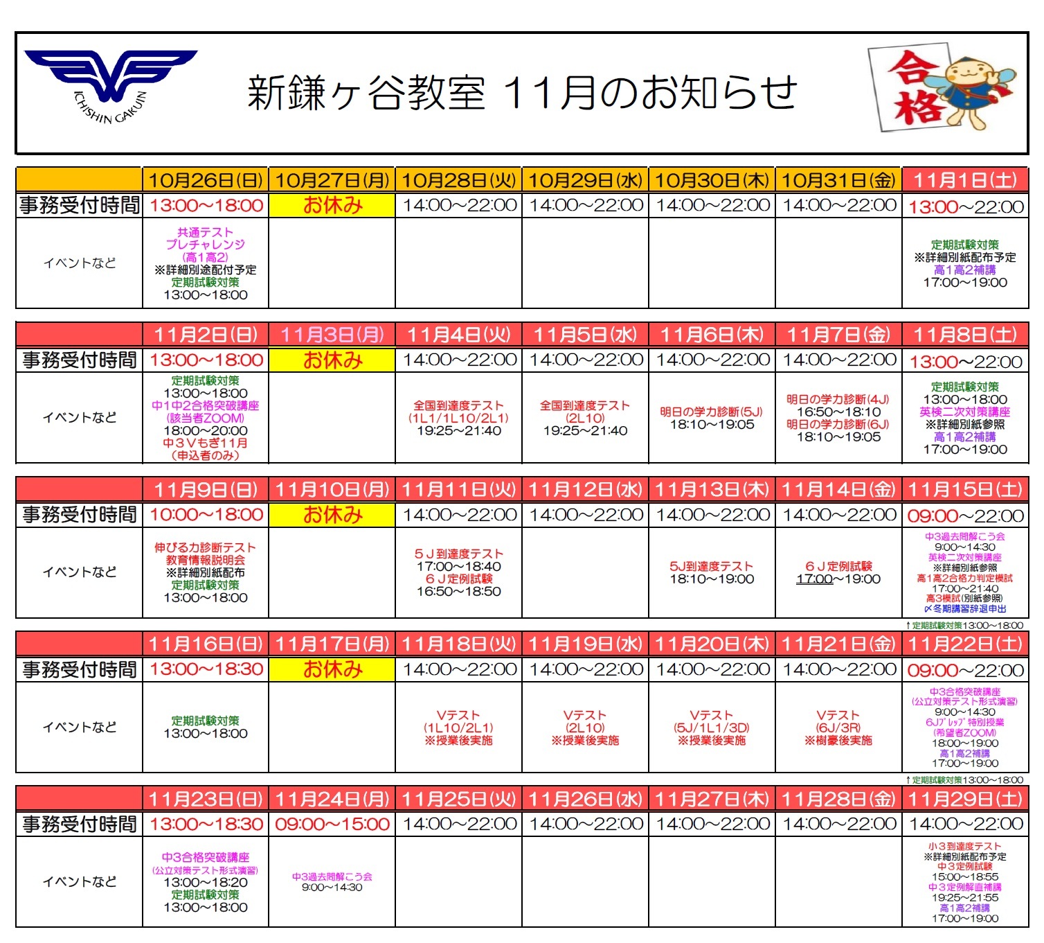 | 冬期講習受付中! | 11月開室時間のお知らせ | 二学期期末試験対策!頑張ろう!市進生! |