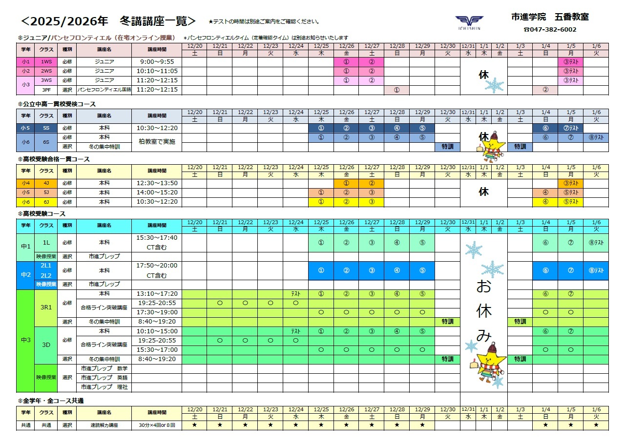 12/30~1/3まで五香教室は教室閉じ日です。 自習室の利用もできません。 ご注意ください。 1/4、午前10時以降から使用可能です。 よろしくお願いいたします。 五香教室:スタッフ一同 |