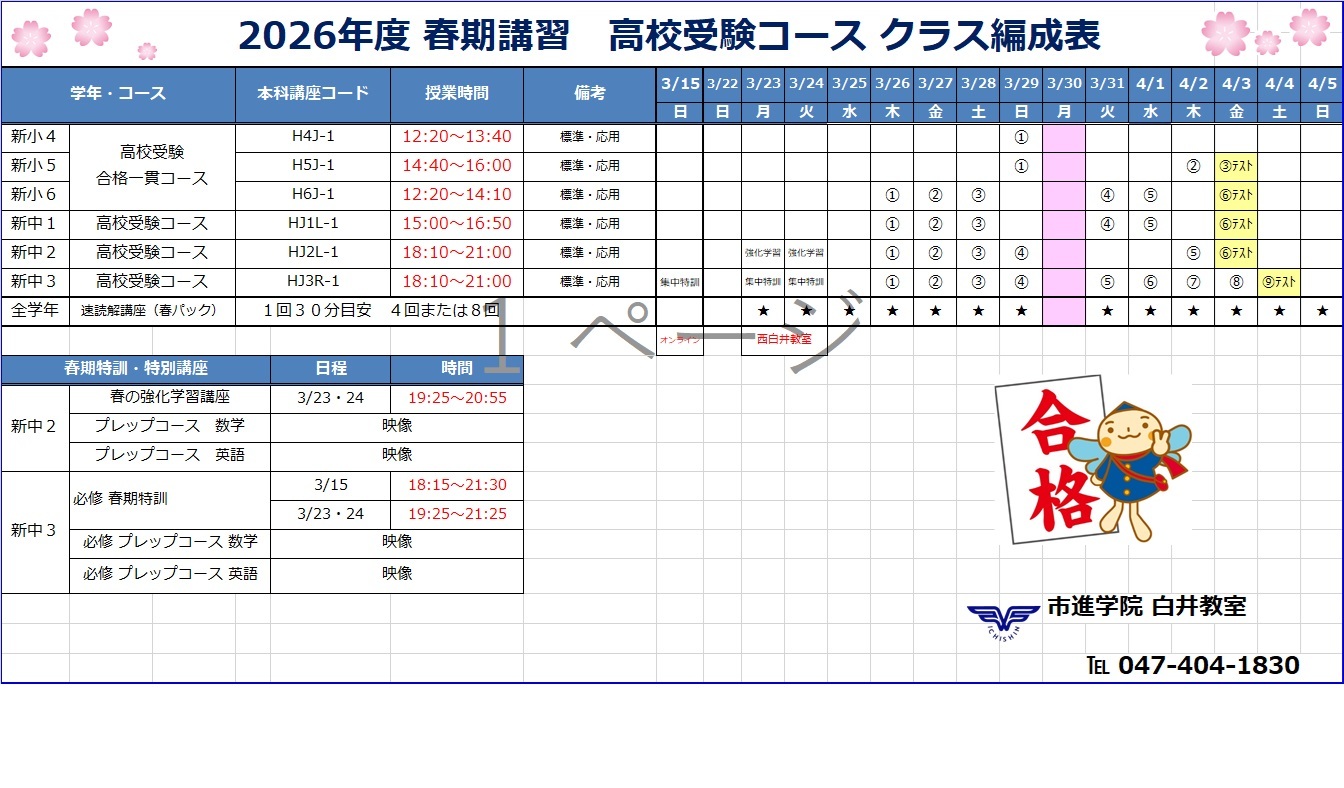 体験授業は以下の日程で 小4(高校合格一貫コース)…4月9日 (木) 16:50~18:10 小5(高校合格一貫コース)…4月8日 (水) 16:50~18:30 小6(高校合格一貫コース)…4月7日 (火) 16:50~18:50 中1…4月9日(木) 19:25~21:25 中2…4月8日(水) 19:25~21:25 中3…4月7日(火)、9日(木) 19:25~21:25 教材の準備がありますので,教室までお電話にてご予約の上,当日は筆記用具,ノートをお持ちください。 白井教室 047-404-1830 |