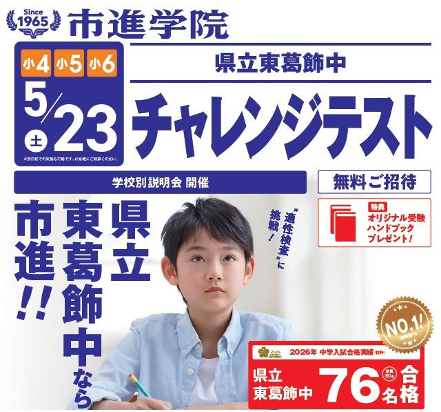 2026春、県立東葛飾中に76名の合格者を送り出した市進が「適性検査模試」を行います。「適性検査」が初めてという方も、お気軽にご参加ください。