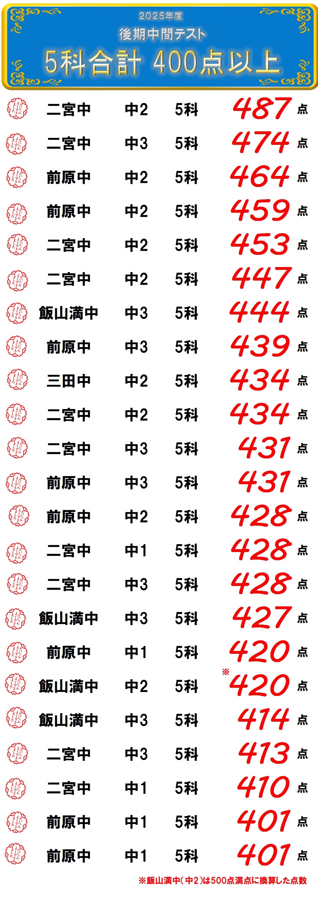 中3 女子> ・理科の苦手意識が無くなり、高得点をとれるようになった。 ・プリントをやったおかげでテストの記述問題をスラスラとけた。 ・全体的に点数がアップした。 <前原中 中3 男子> ・教科に偏りなく、5科目バランスよく点を取ることができた。 ・漢字と文法の問題で満点をとれた。 ・苦手な理社の課題をしっかりと理解し、それぞれ良い点をとることができた。 <三田中 中3 女子> ・苦手だった理社で80点台がとれた。 ・前回の合計点数から60点UPした。 <二宮中 中2 男子> ・社会が過去最高点だった。 ・今回のテストは数学の応用問題が増えていたが、応用問題が解けた。 <二宮中 中2 女子> ・数学が学年で1人だけ100点だった。 ・社会が約40点あがった。 <前原中 中3 女子> ・国語で初めて80点台をとれた。 ・合計が20点上がった。 <前原中 中3 男子> ・10点前後上がった教科が多かった。 ・数学の応用問題が解けた。 ・社会の記述が満点とれた。 <二宮中 中3 男子> ・合計点が70点上がった。 ・数学では90点を取れた。 ・英語が苦手だったけど、点数が17点上がった。 ・いつも漢字のミスがあったけど、今回はミスなくいけた。 <二宮中 中2 男子> ・英語の点数が90点台になった。 ・苦手な漢字の問題で満点が取れた。 ・苦手な英語の単語の問題で満点が取れた。 ・国語で過去最高点がとれた。 ・社会の地理分野で満点がとれた。 <飯山満中 中3 女子> ・いつも70点台の社会が87点になった。 ・国語の作文問題で満点がとれた。 <前原中 中1 女子> ・苦手な社会で98点取れた。 <二宮中 中1 女子> ・英語のリスニングで満点がとれた。 ・全教科平均点以上とれた。 <前原中 中2 女子> ・社会が20点、理科が10点上がった。 <前原中 中2 女子> ・理科が30点上がった。 ・問題を解く速度が上がった。 <二宮中 中3 男子> ・国語の作文で模範解答になった。 <二宮中 中1 女子> ・集中力が続くようになった。 <二宮中 中2 女子> ・いつもより勉強の達成感があった。 |