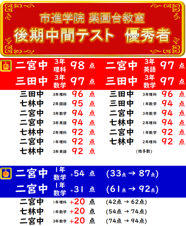 中3 二宮中 理科 98点 中1 二宮中 数学 +54点(33→87点)