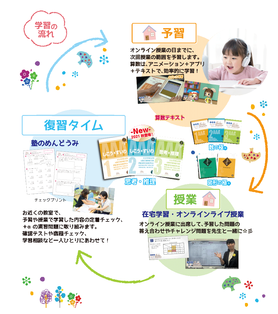 ![]() 算数の「本質」を追求した学習プログラム! ただの機械的な計算ではなく、 なぜそうなるのか? 文章題での式の立て方、 徹底的に理解させます。 「教室でのめんどうみ」 とセットな講座になります。 低学年であるからこそ、 低学年でしかできないこと、 着実に行ってまいります。 とにかく楽しくて、ワクワクして、 未来につながる授業、 ぜひご体験ください。 すべての授業に見逃し配信がございますので、万が一の欠席の時も安心です。 その他、国語やAR理科実験など楽しい講座もたくさんございます! ぜひ教室担当までご連絡お待ちいたします。 |