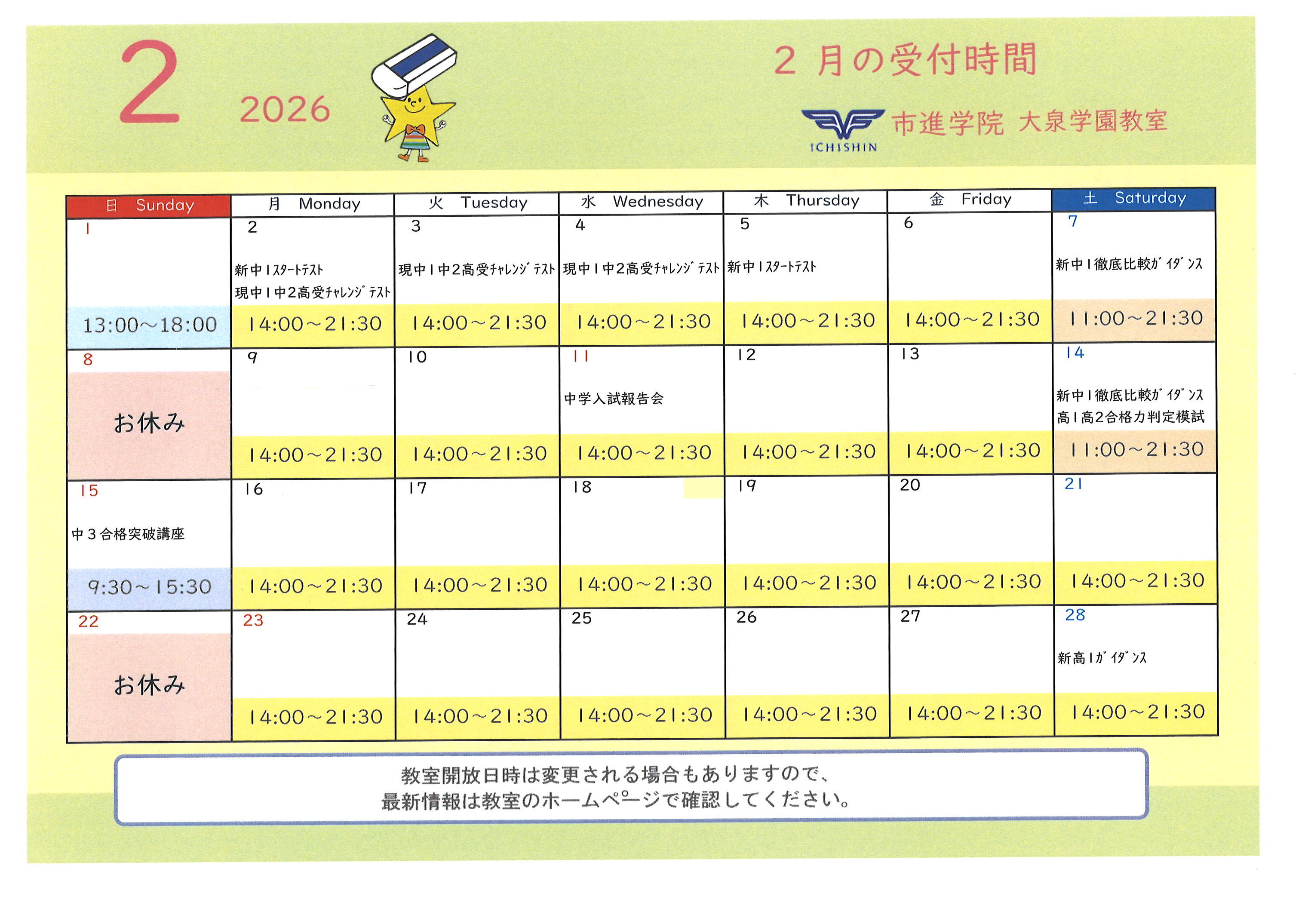 | 新中1スタートテスト | 2月度 教室開室時間 | 2026年春 新中1 新生活 全力応援! |