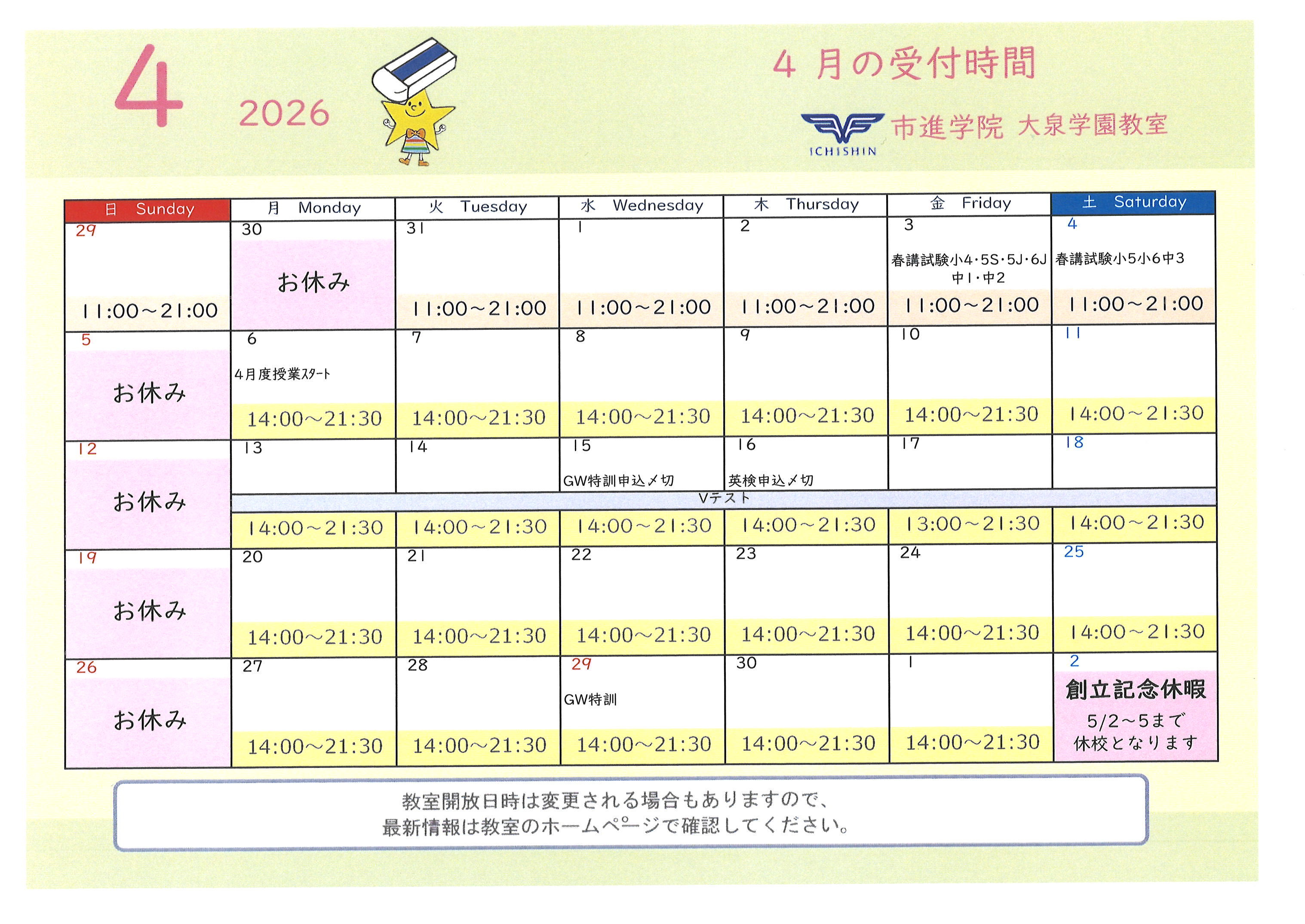 | 高校入試報告会&新中1スタートテスト | 4月度 開室時間 | 【2026年春】★大学入試合格実績★ 大泉学... |