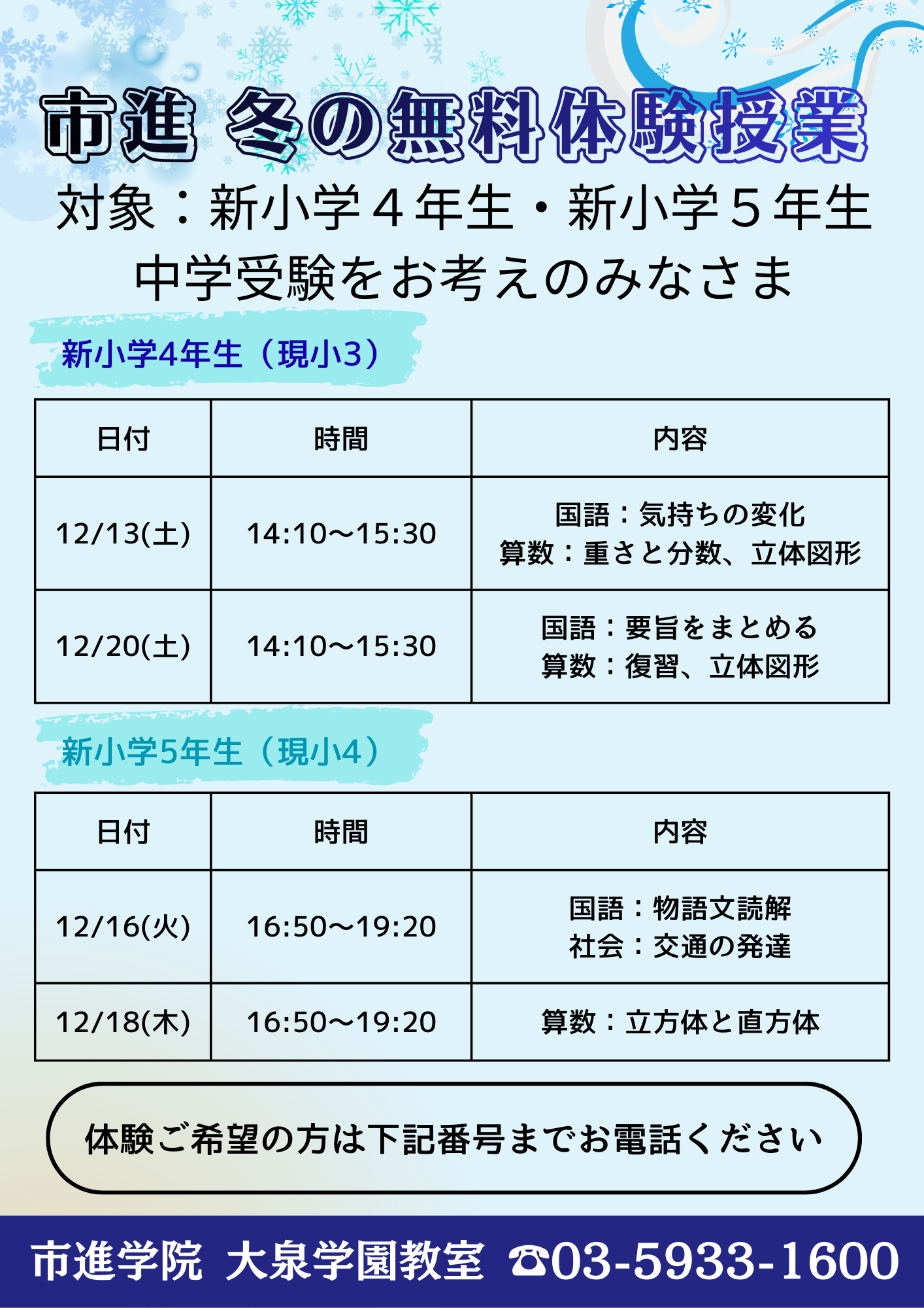 | 新小学4・5年生 | 冬の無料体験 |