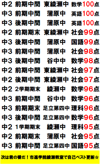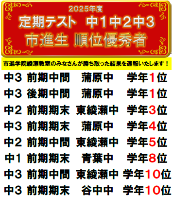 定期テストの結果【2025年度】をお知らせ致します。 ※2026年1月時点 素晴らしい順位・高得点獲得、本当におめでとうございます! 次回も綾瀬教室で対策をして、全力で結果を出しましょう! 体験授業お待ちしております。 |