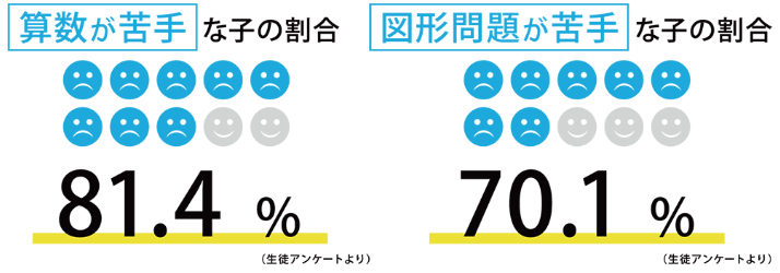中でも「図形分野」に対する苦手意識を持つお子さまは、全体の7割を占めています。 「図形」の苦手が「算数嫌い」につながっているのです。
