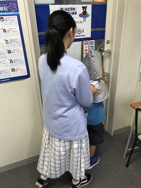 職員の指示に従って、机の下に身を隠したり、防災頭巾の使い方について