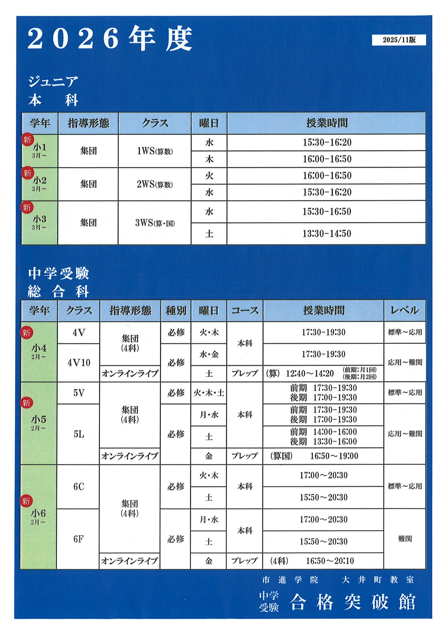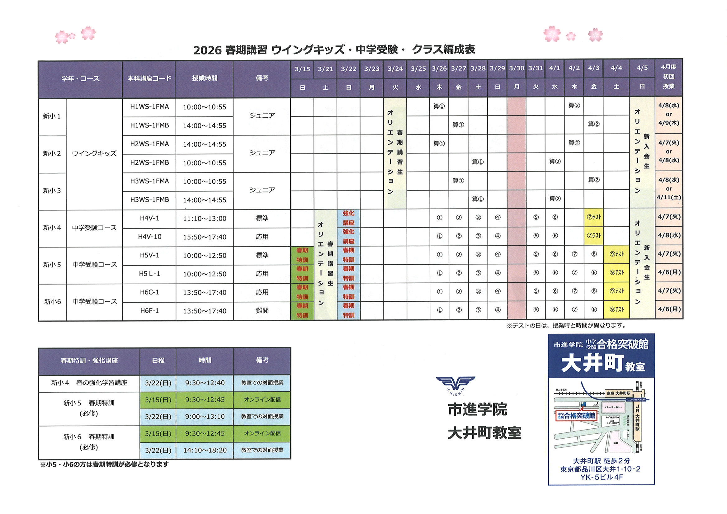 | 【大井町教室】20026年 春期講習クラス編成表 | |