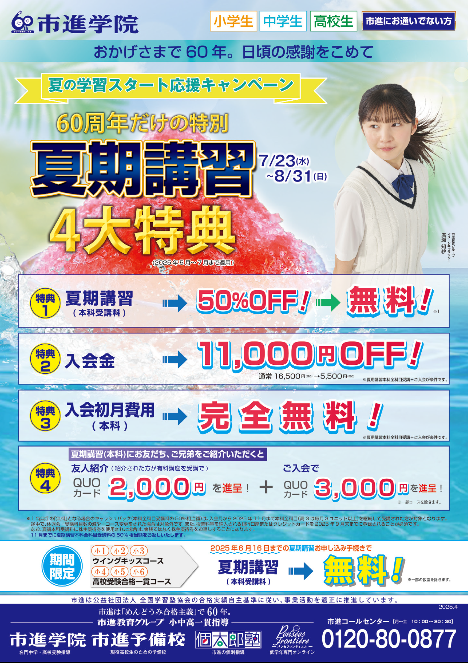 市進学院は今年で開校60周年!日頃の感謝を込めてお得なキャンペーンを実施中です!