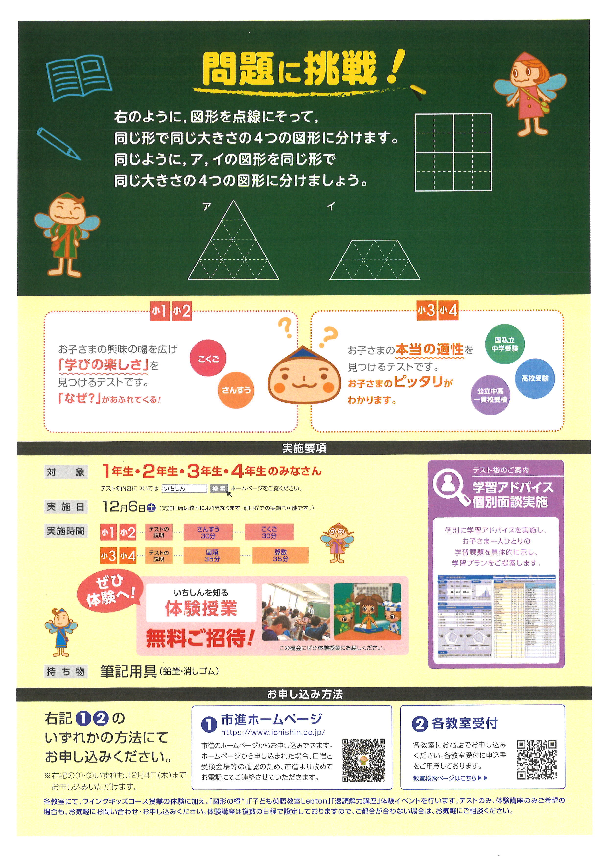 A、市進では、これから通塾をご検討されているお子様向けに、無料の体験授業を行っております。ご希望の際は、若葉台教室(042-350-5151)または ホームページにてお申込みください。