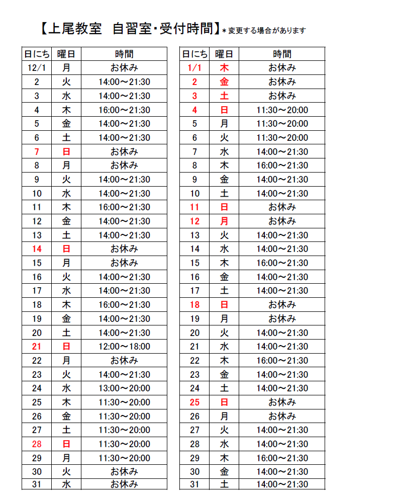12月24日~1月6日までは冬期講習期間となり、自習室開室時間、営業時間が変更になります。