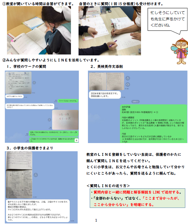 (5)1科目から受講可能(小・中・高)集団も個別も映像も1科目から受講が可能です。 (6)2者面談・3者面談の実施(小・中・高)保護者の方や生徒との連絡を密にしています。授業の様子をお伝えしたり、具体的な学習アドバイスをします。ラインによる質問対応もしています。 まずは、定期試験の問題と解答用紙をご持参ください。その2つを見て、お子さまの課題を的確に指摘し、最善の学習法をご提案します。 |