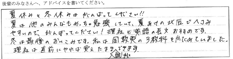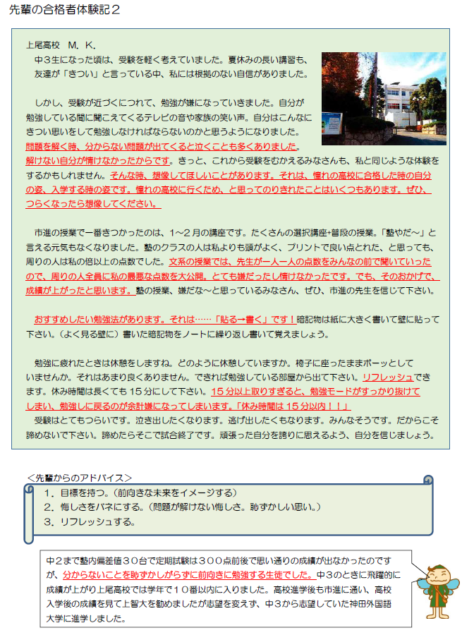 今、成績が低迷していても、先生のアドバイスを聞いて実践すれば過去問や予想問題に頼らなくても点数は上がります。そして、それが高校や大学での学びに繋がります。