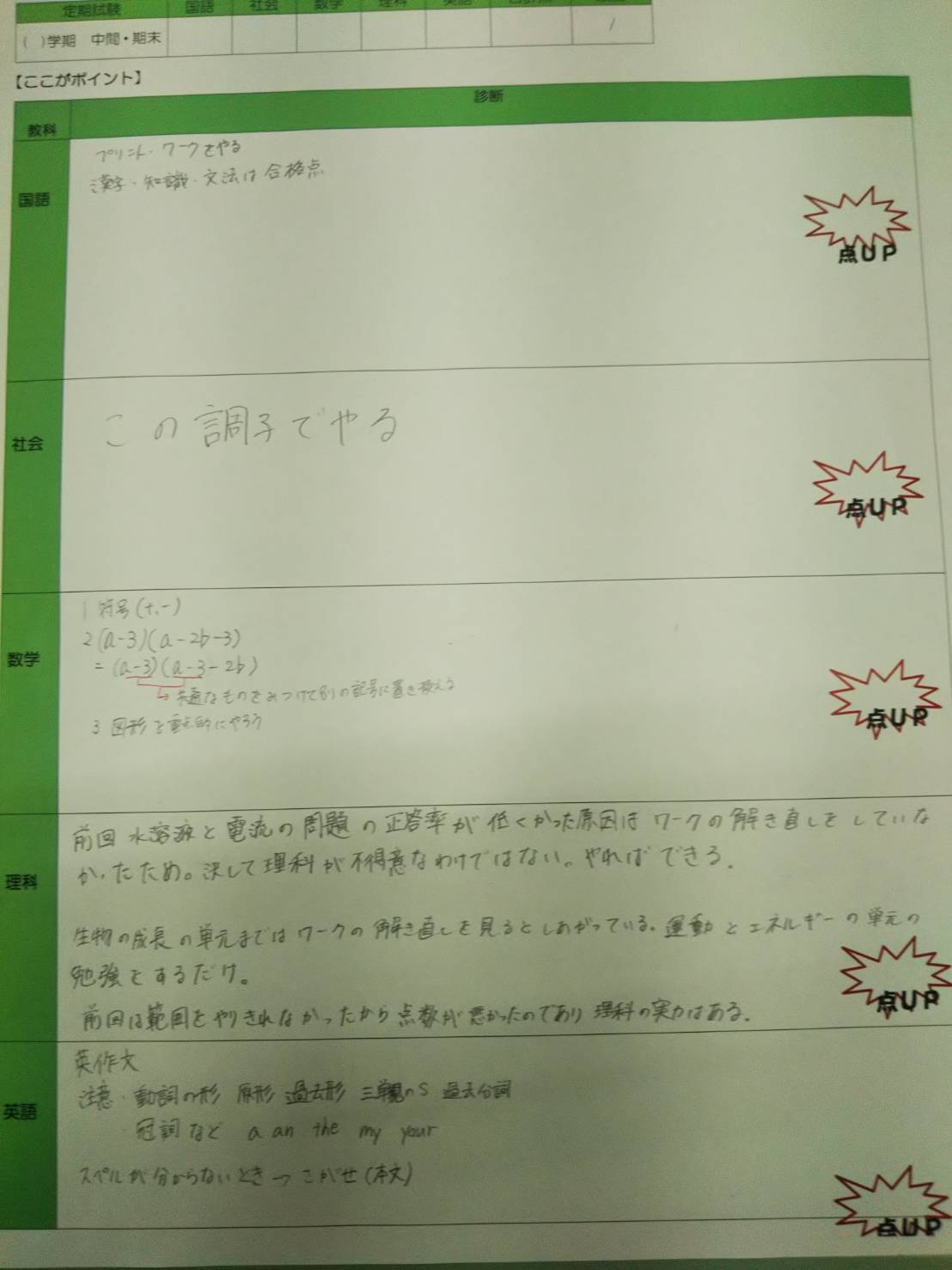 定期試験の点数を上げるのは、過去問や予想問題を解くことではなく、範囲を把握し、漢字や英単語を覚え、中学校のワークをしっかりと解くことです。